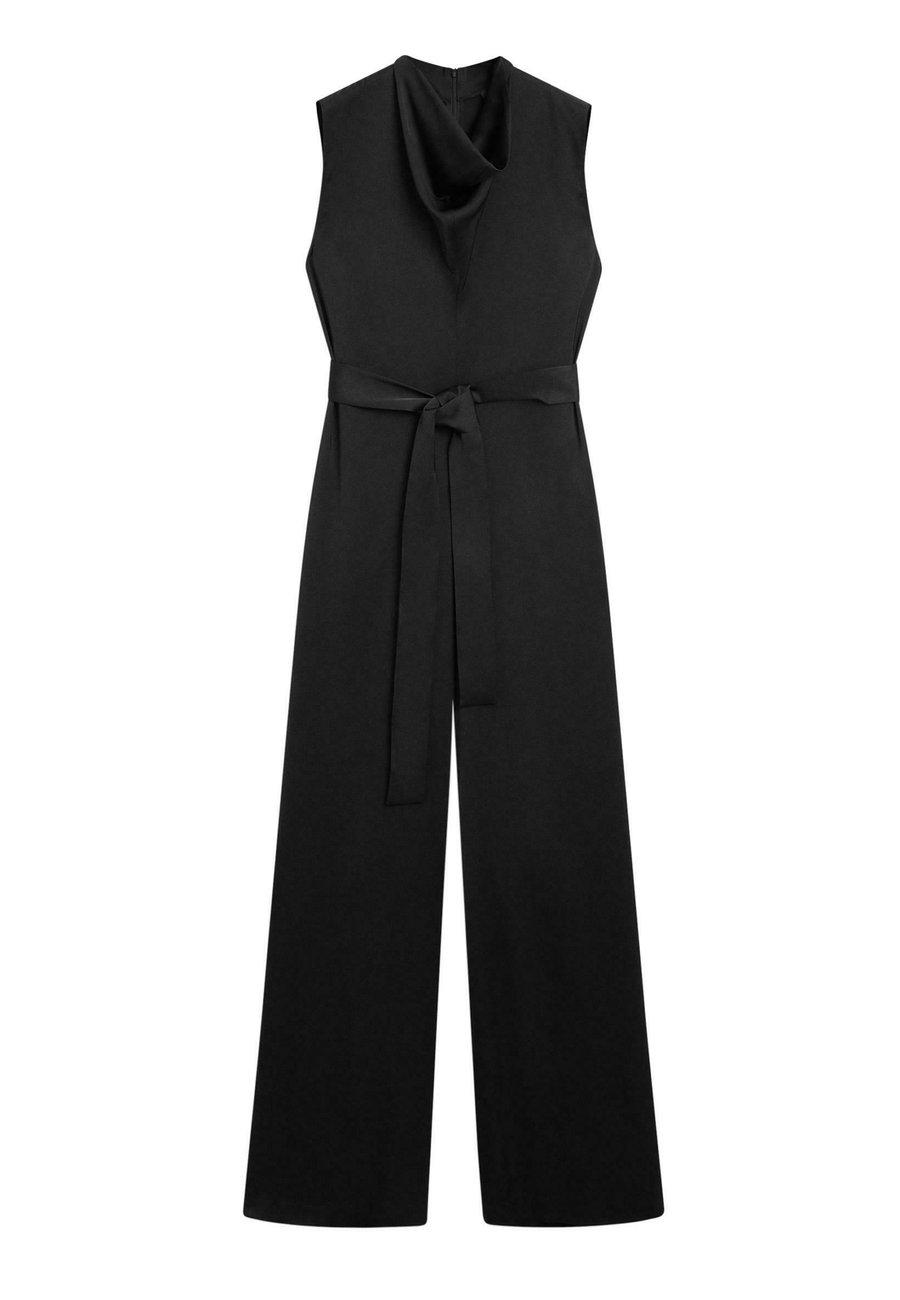 Застежка-молния сзади. Два боковых кармана. Без рукавов. Комбинезон из струящейся атласной ткани. В комплекте пояс. Драпированный воротник. Воротник: стоячий.Материал и уход