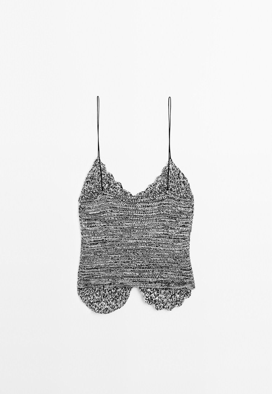 V-образный вырез. Это изделие короче обычного. С бретелями. Изготовлено из пряжи мулине, которая обеспечивает очень характерный двухцветный вид. Вязаный крючком топ из хлопковой смеси. Асимметричная отделка. Вырез: глубокий V-образный.Материал и уход