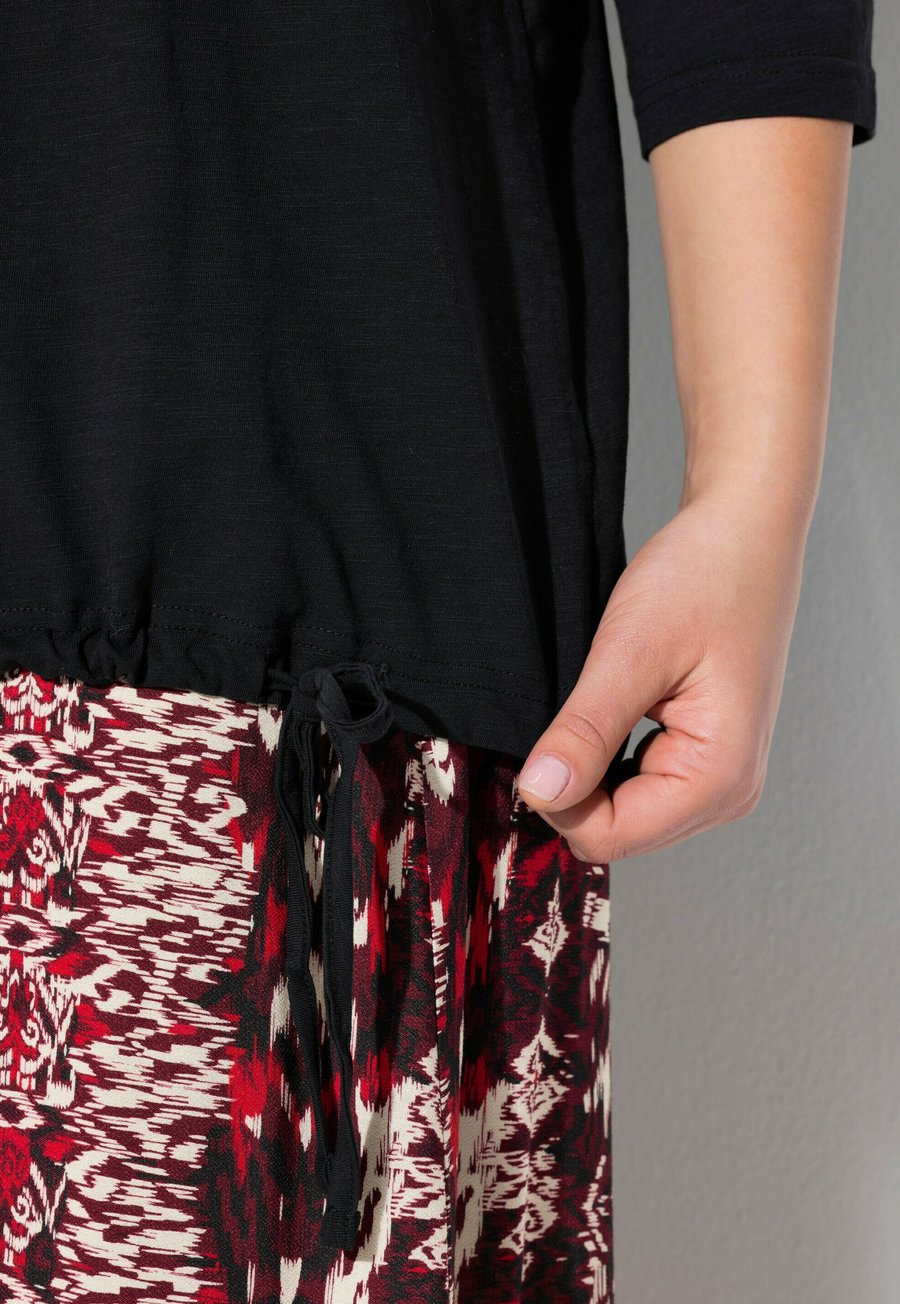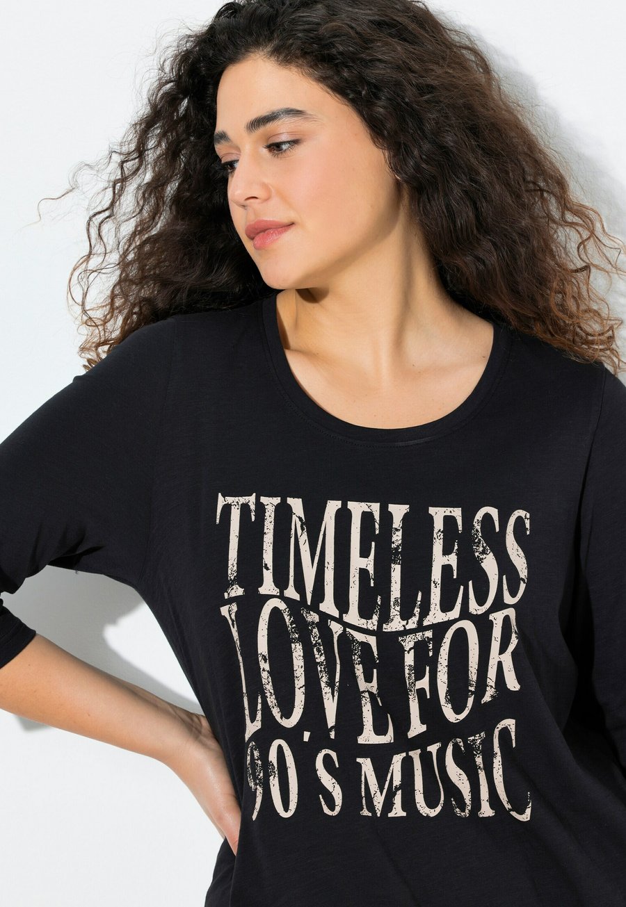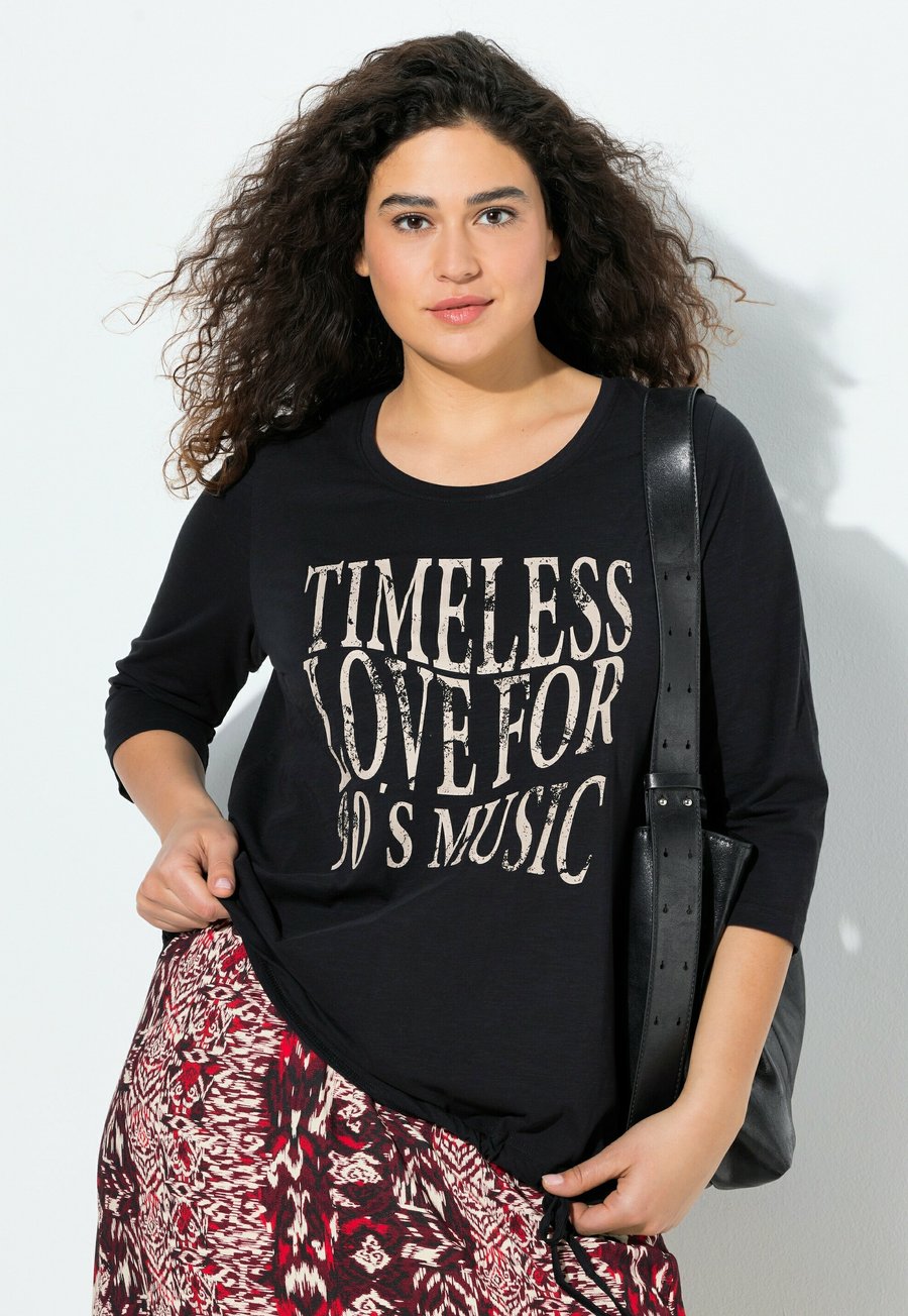 Футболка с принтом "Вне времени любовь": "В 90-х было лучше...". Круглый вырез. Надпись "Вне времени любовь к музыке 90-х" на груди. Рукава 3/4. Регулируемый низ на шнурке. Инструкции по уходу: Не сушить в сушильной машине, машинная стирка. Вырез горловины: Круглый.Материал и уход