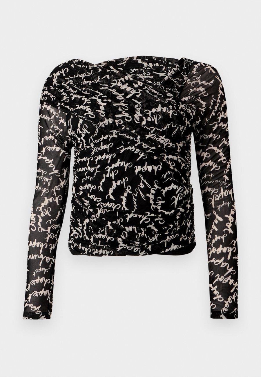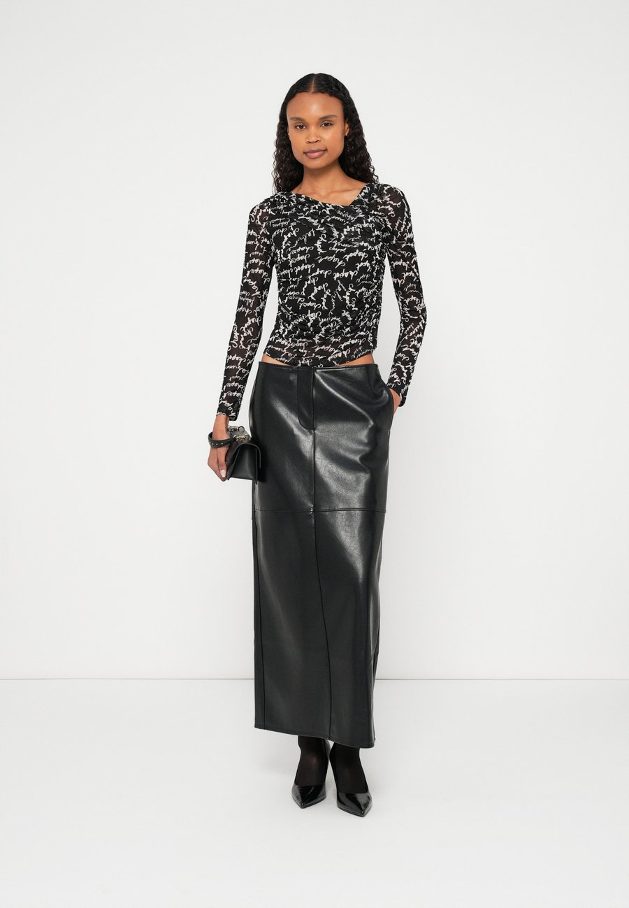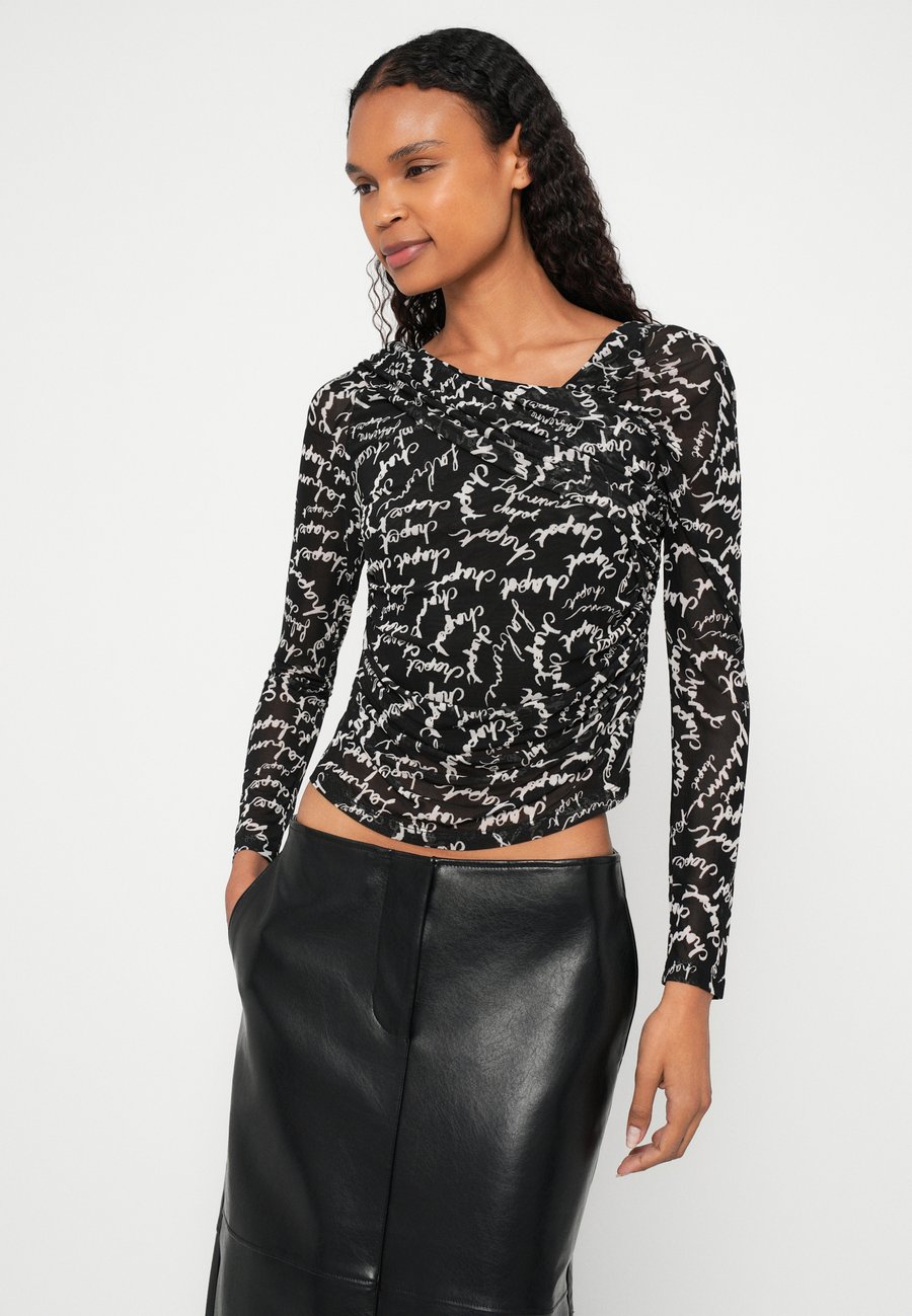 Этот черно-белый топ украшен эффектным принтом в виде надписи по всей поверхности и имеет современный драпированный вырез, создающий непринужденно элегантный образ. Изготовлен из 94% переработанного полиэстера, сочетает в себе стиль и экологичность. Идеально подходит для насыщенных дней, повседневных прогулок или нарядных вечеров. Вырез: Открытая спинаМатериал и уход