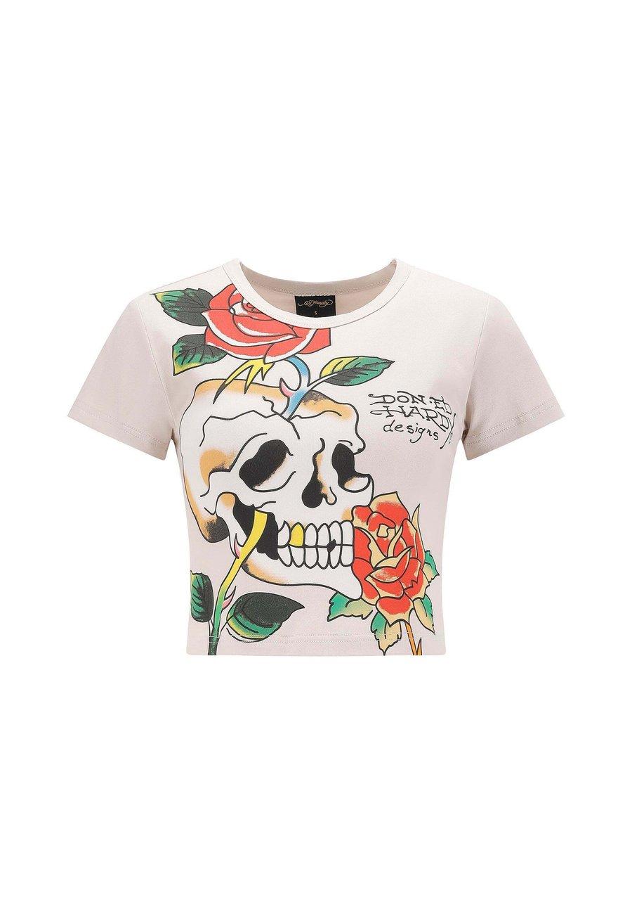 Женская детская футболка с изображением черепа и вьющейся розы, цвет экрю. Укороченный и приталенный крой. Крупный принт черепа спереди. Вышивка на задней части воротника. Легко тянется. 95% хлопок, 5% спандекс, трикотаж 180 г. Наша модель (рост: 173 см, талия: 71 см) носит размер S. Вырез: круглый.Материал и уход