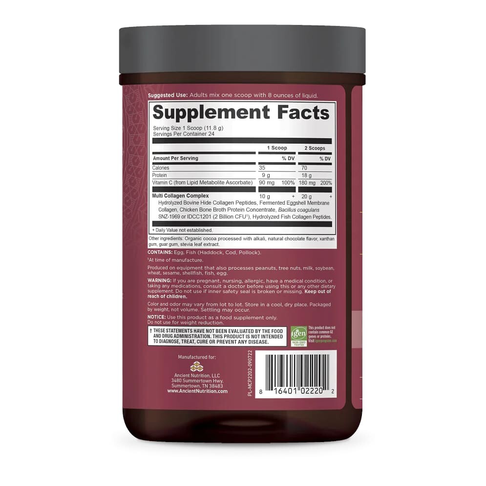 Биологически активная добавка в форме порошка с шоколадным вкусом. Состоит из 10 типов коллагена, пробиотиков SBO и витамина С. Клинически изученный ферментированный коллаген мембран яичной скорлупы, обеспечивающий коллаген типов I, II, III, IV, V, VII, VIII, X, XII, XXII поддерживает здоровье суставов, кишечника и кожи. Гидролизованные пептиды рыбного коллагена, который получают из экологически чистых источников минтая, трески и пикши (сига) из вод Северной Америки, естественным образом богаты коллагеном типа I, который участвует в формировании костей, кожи, фасций, связок, сухожилий и кровеносных сосудов. Гидролизованные пептиды бычьего коллагена содержат коллаген типов I и III и обеспечивают поддержку здоровья ногтей, кишечника, суставов и кожи. Клинически изученные пробиотики SBO оказывают дополнительную поддержку для пищеварительной системы. Клинически изученный витамин С обладает мощными антиоксидантными свойствами.