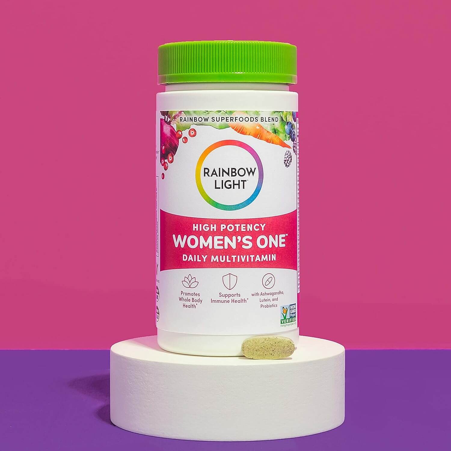 Мультивитамины Rainbow Light Womens One High Potency Daily Multivitamin с готовыми к усвоению минералами созданы для оптимального питания и восполнения запасов энергии, обеспечивая прочную основу для движения вперед. Этот ежедневный мультивитамин для женщин способствует оздоровлению всего организма и поддерживает иммунное здоровье. Он содержит 100% или более суточной нормы 19 витаминов и минералов. В его состав входят ашвагандха, лютеин и пробиотики, а также больше витамина С и биотина, чем в предыдущем мультивитамине Womens One. Он способствует нормальному энергетическому обмену веществ, содержит тиамин для поддержания нормальной работы сердца, а также поддерживает здоровое функционирование мозга. Вегетарианский мультивитамин; проверено Non-GMO Project; сертифицировано C.L.E.A.N., сертифицировано R.A.W.