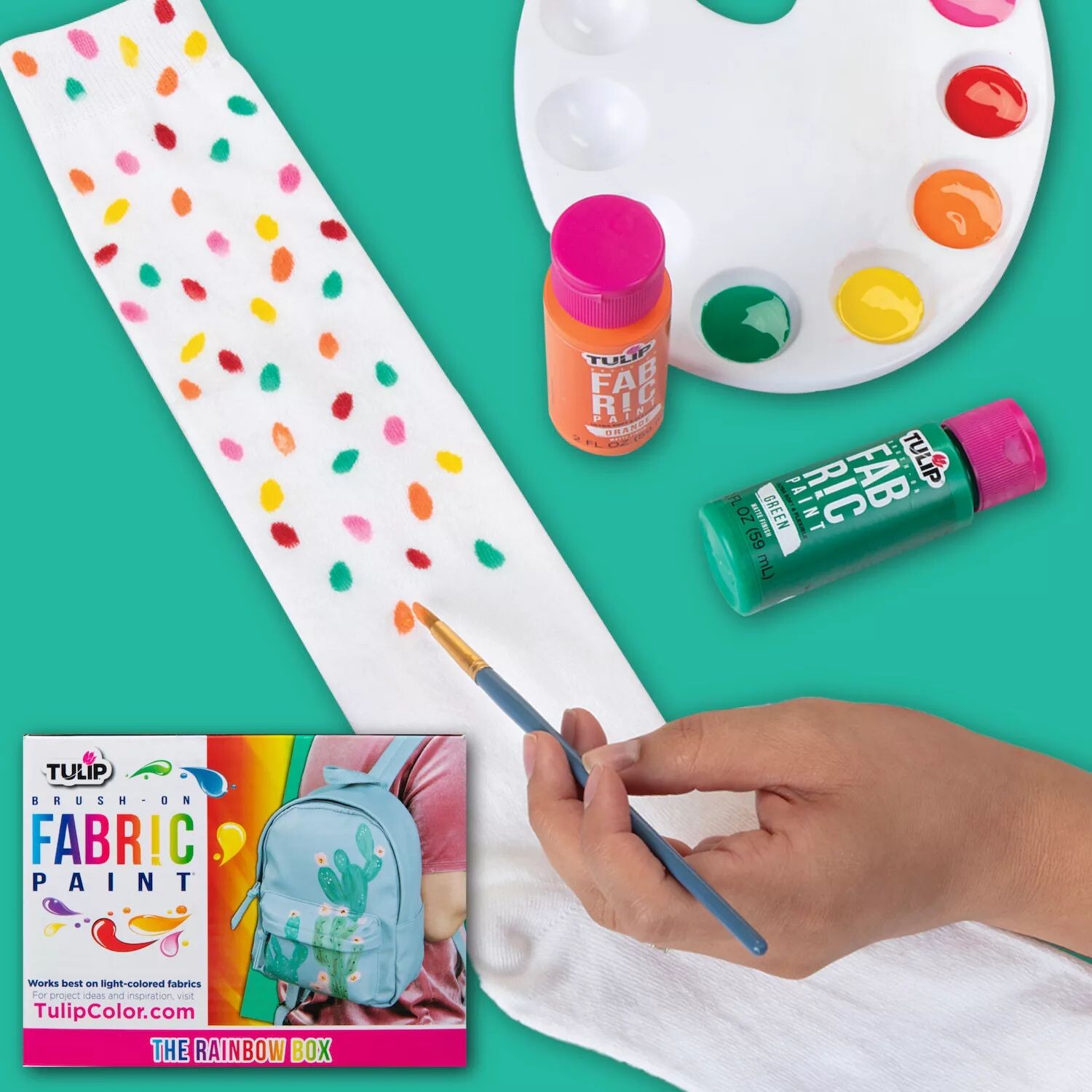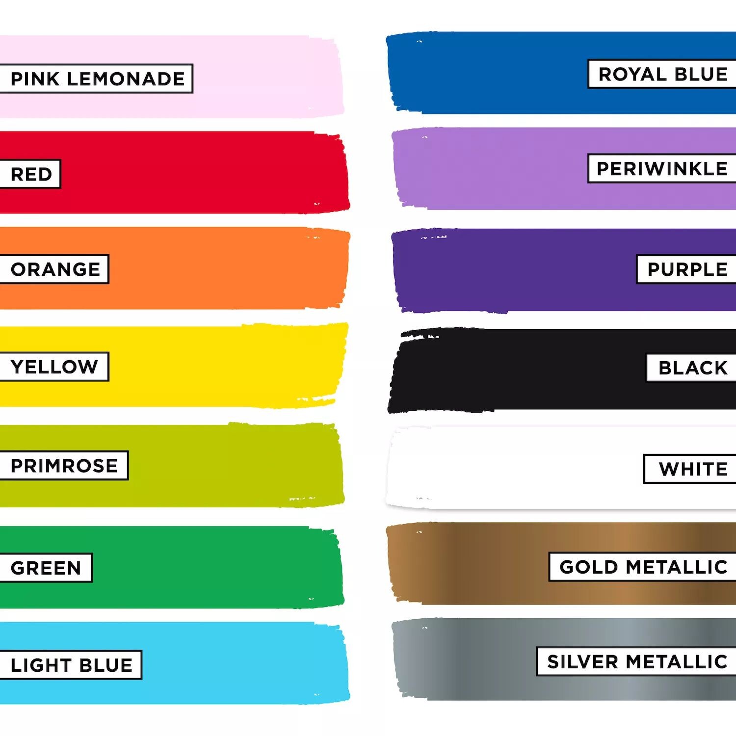 Включает 14 (2 жидких унции) красок для ткани, наносимых кистью, в обязательной палитре основных цветов радуги.