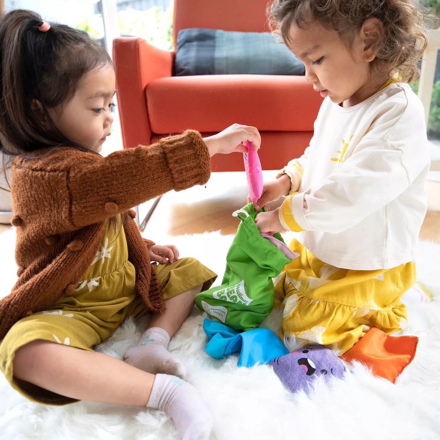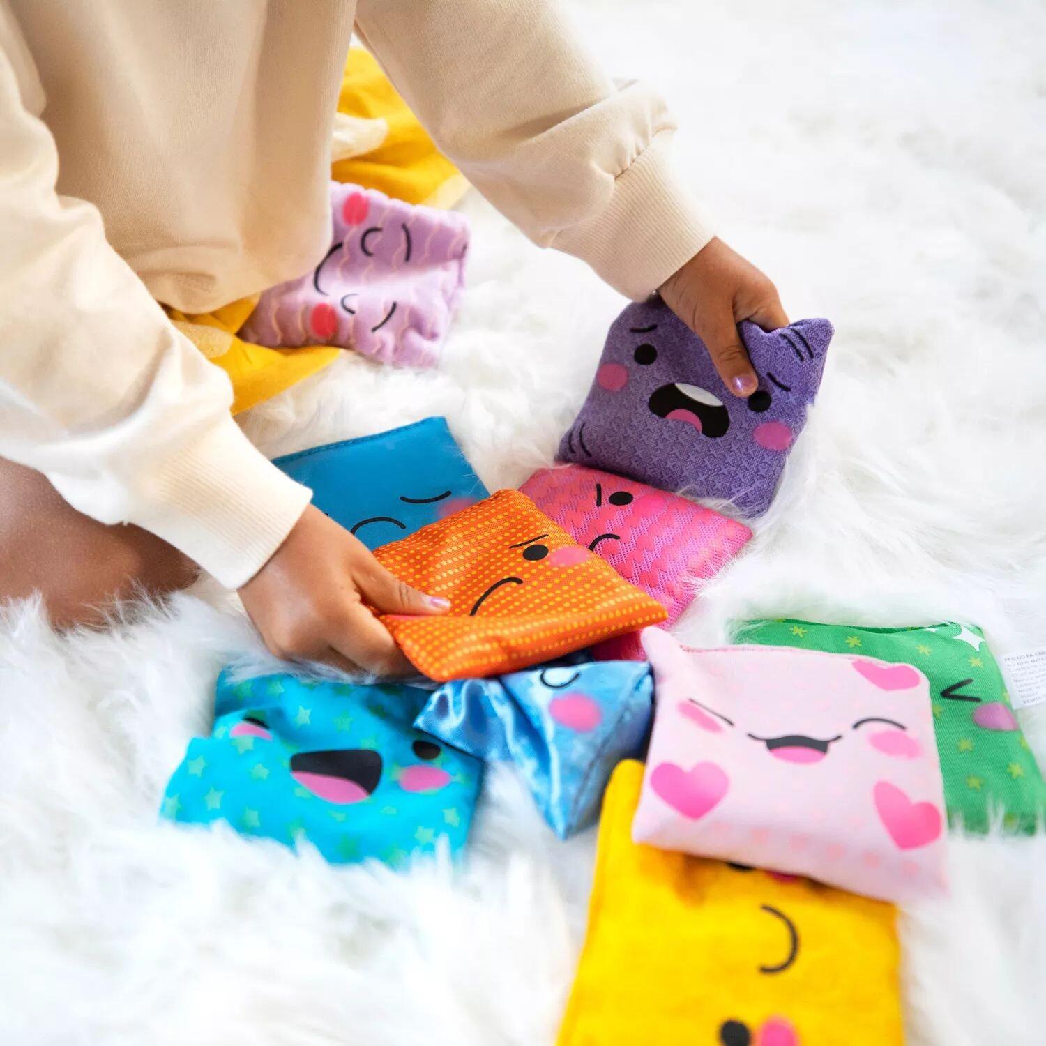 ВКЛЮЧАЕТ: 10 мешков-погремушек размером 4 x 4 дюйма, каждый из которых имеет разный цвет, текстуру и эмоции; сумка для переноски на шнурке; и руководство для родителей/учителей.