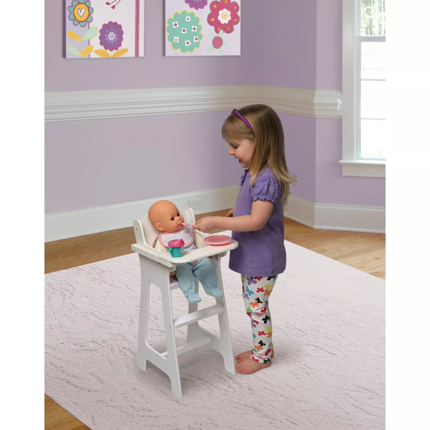 Сохраните ее куклу милой и чистой во время кормления с помощью этого набора стульчиков для кормления куклы Badger Basket.