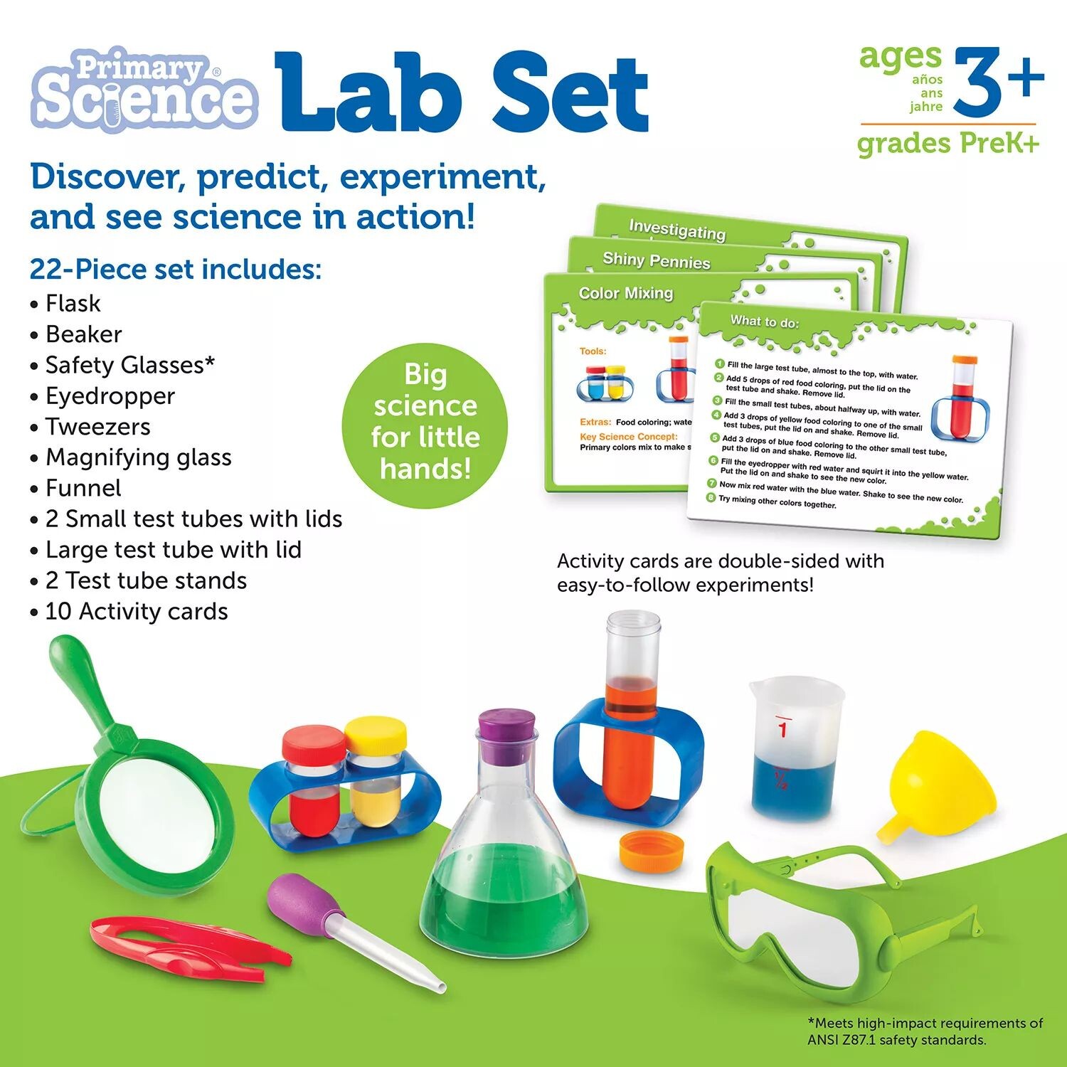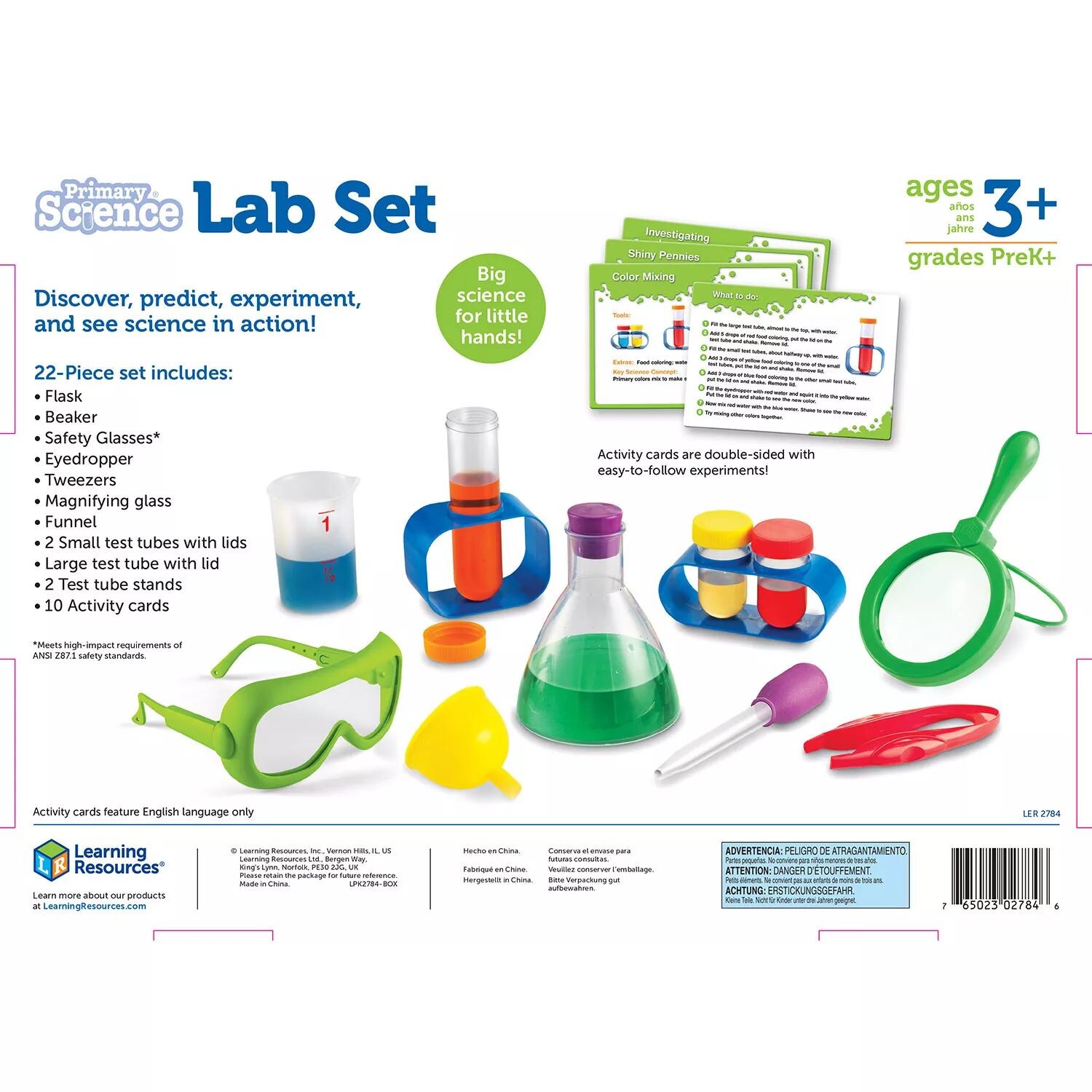 Экспериментируйте и исследуйте с помощью настоящих научных инструментов! Этот красочный набор побуждает к первым практическим научным исследованиям за кухонным столом. В набор из 22 предметов входят: стакан, увеличительное стекло, воронка, пробирки, руководство и карточки с забавными и простыми экспериментами.