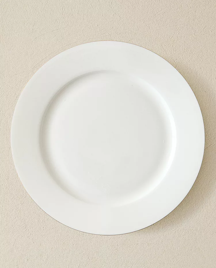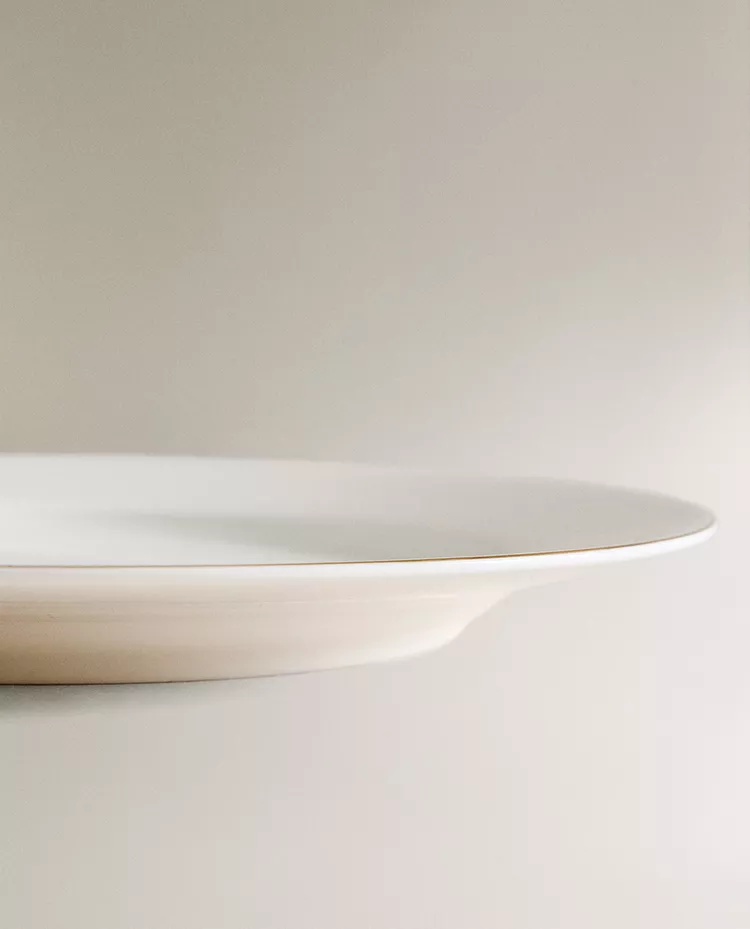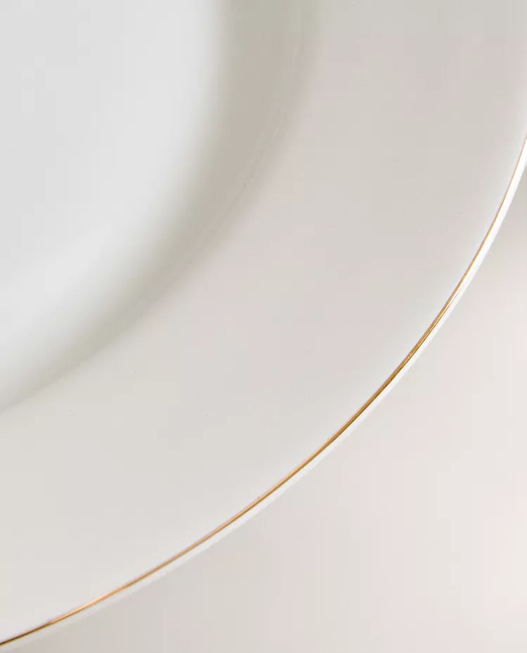 Обеденная тарелка из костяного фарфора. Украшена контрастным ободком.