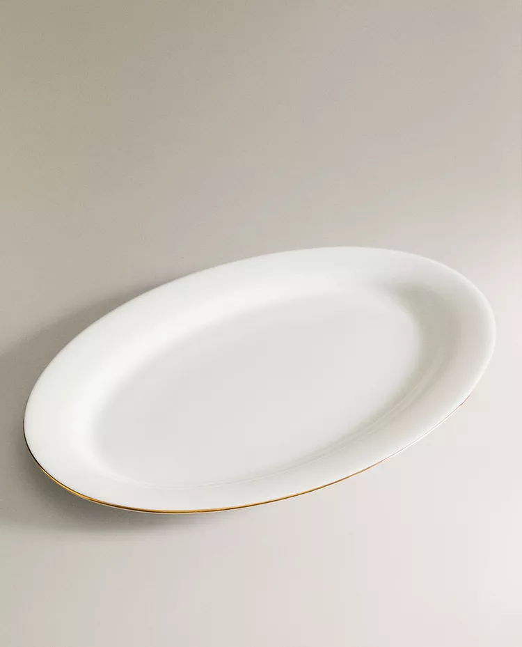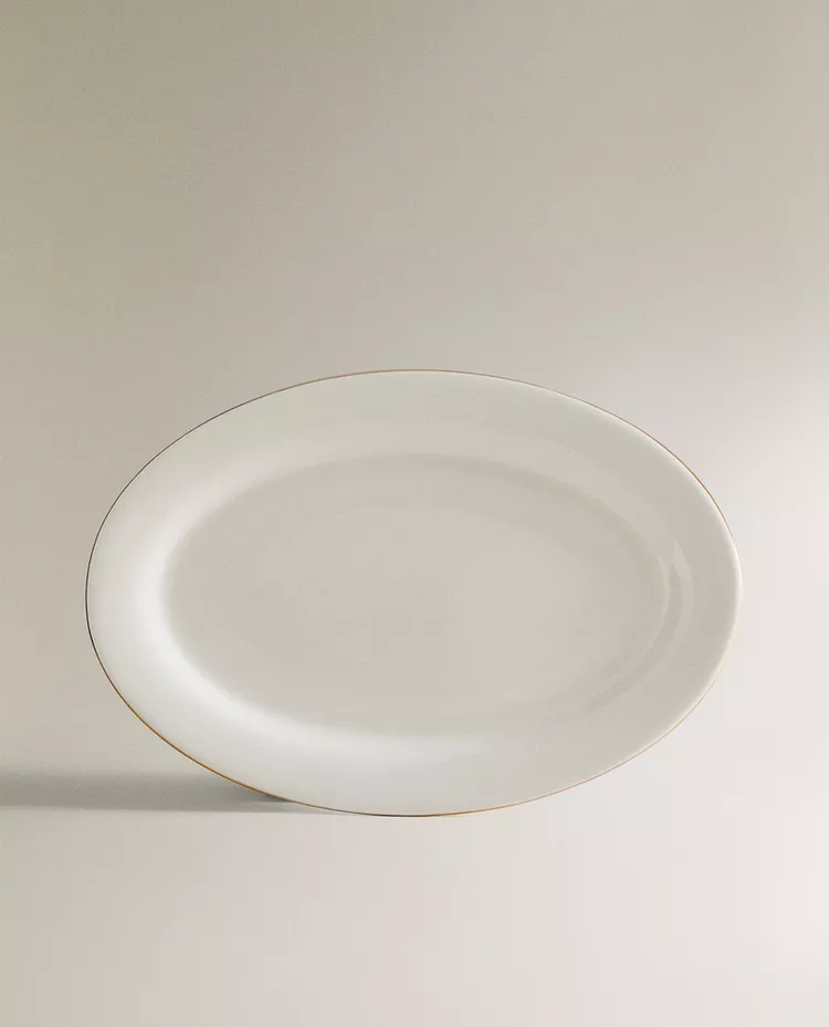 Овальное сервировочное блюдо из костяного фарфора. Украшено контрастным ободком.