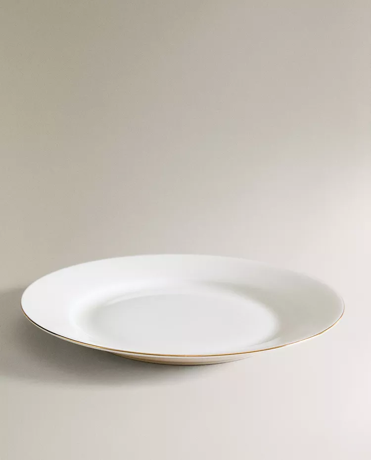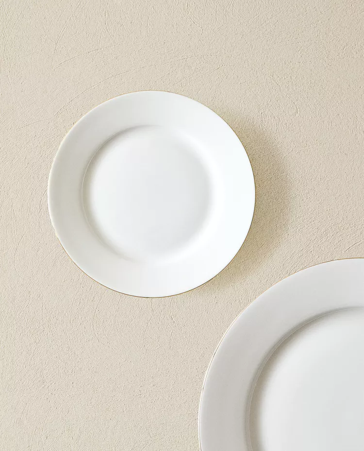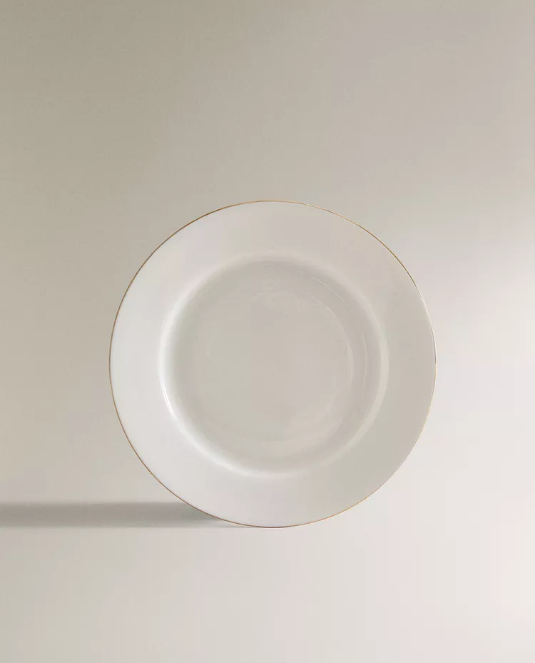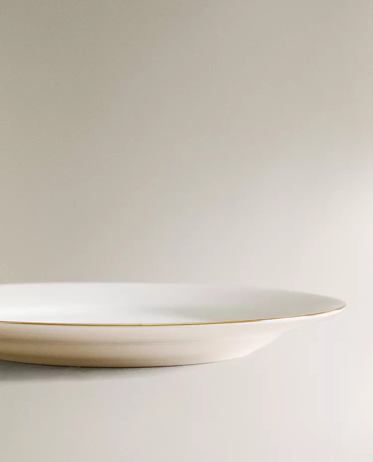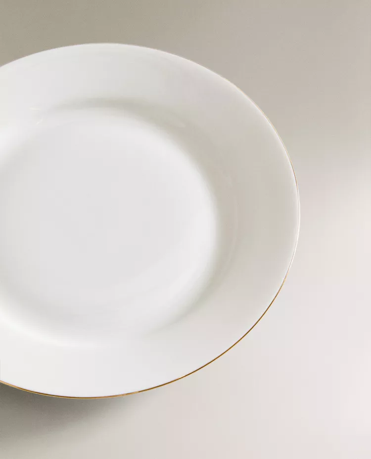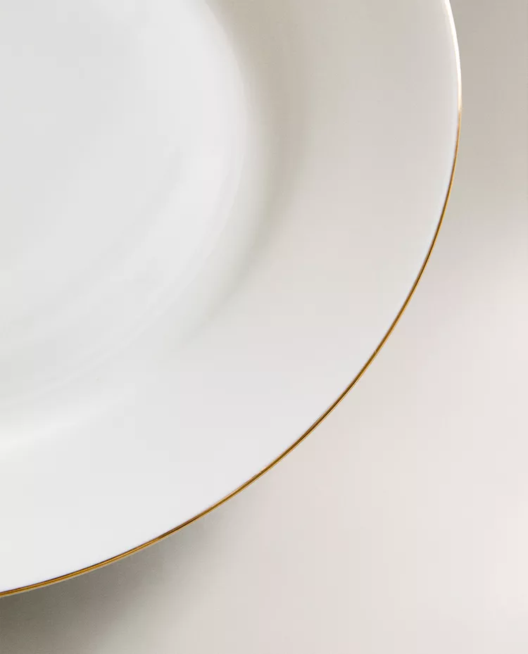Десертная тарелка из костяного фарфора. Украшена контрастным ободком.