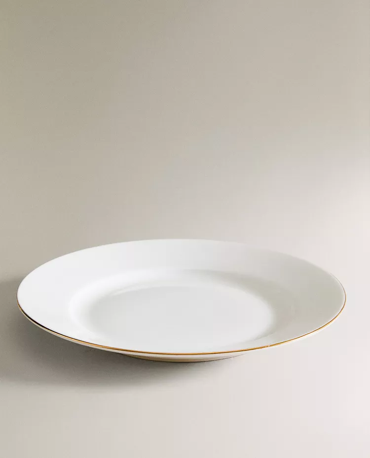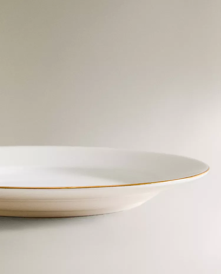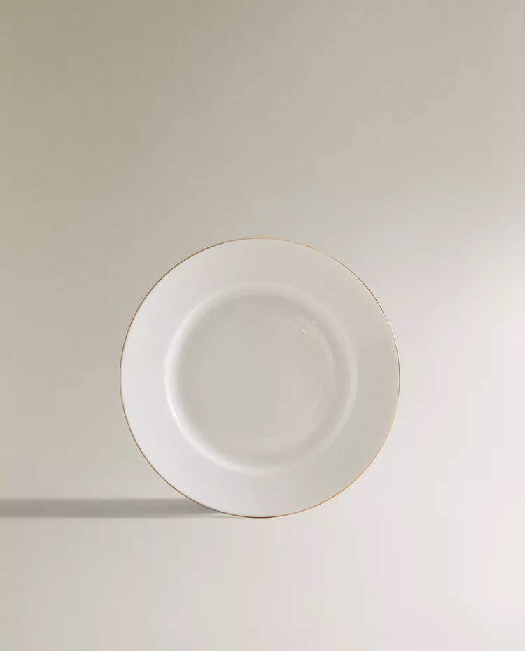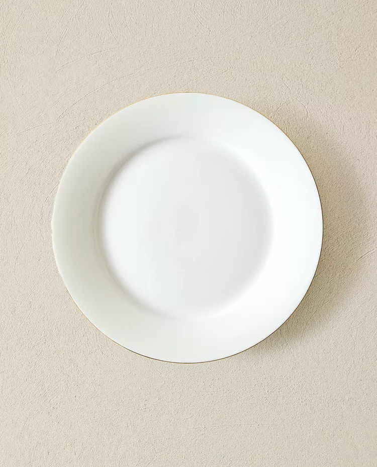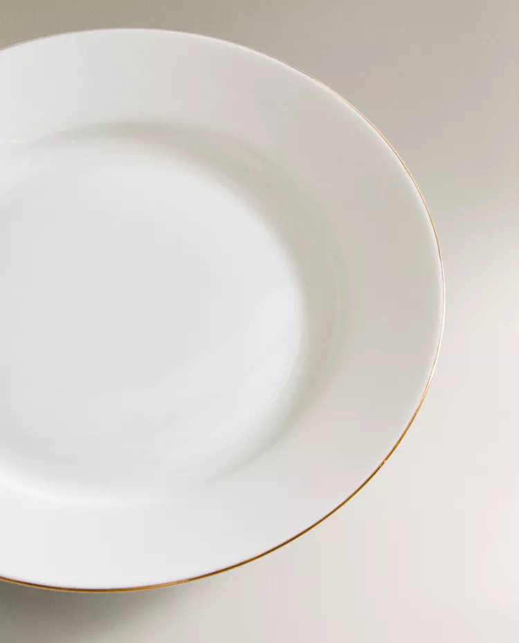 Боковая тарелка из костяного фарфора. Украшена контрастным ободком.