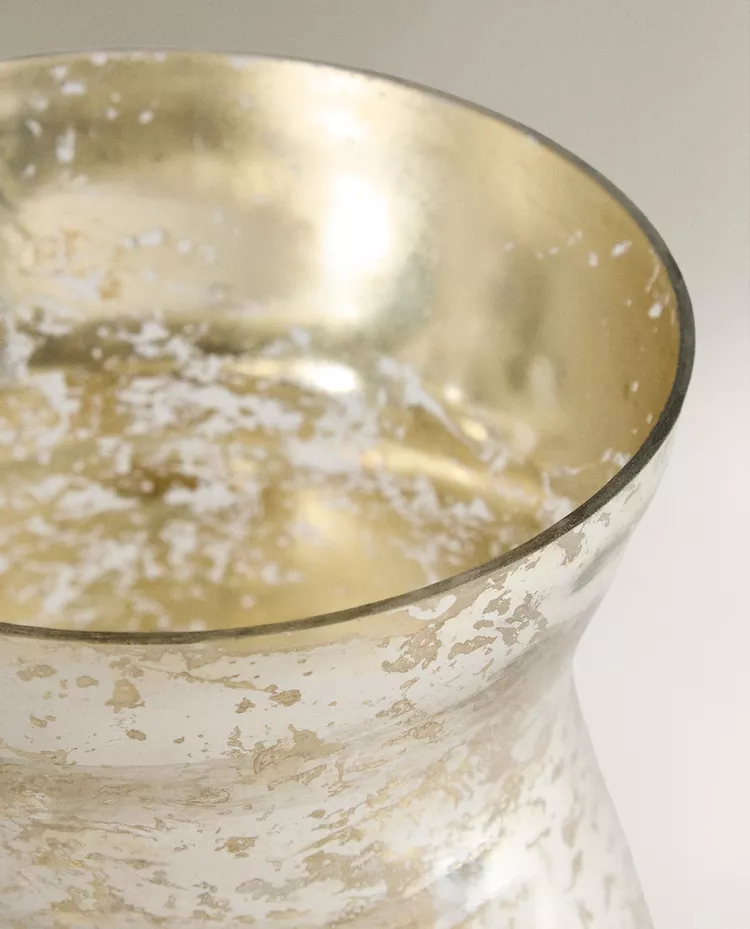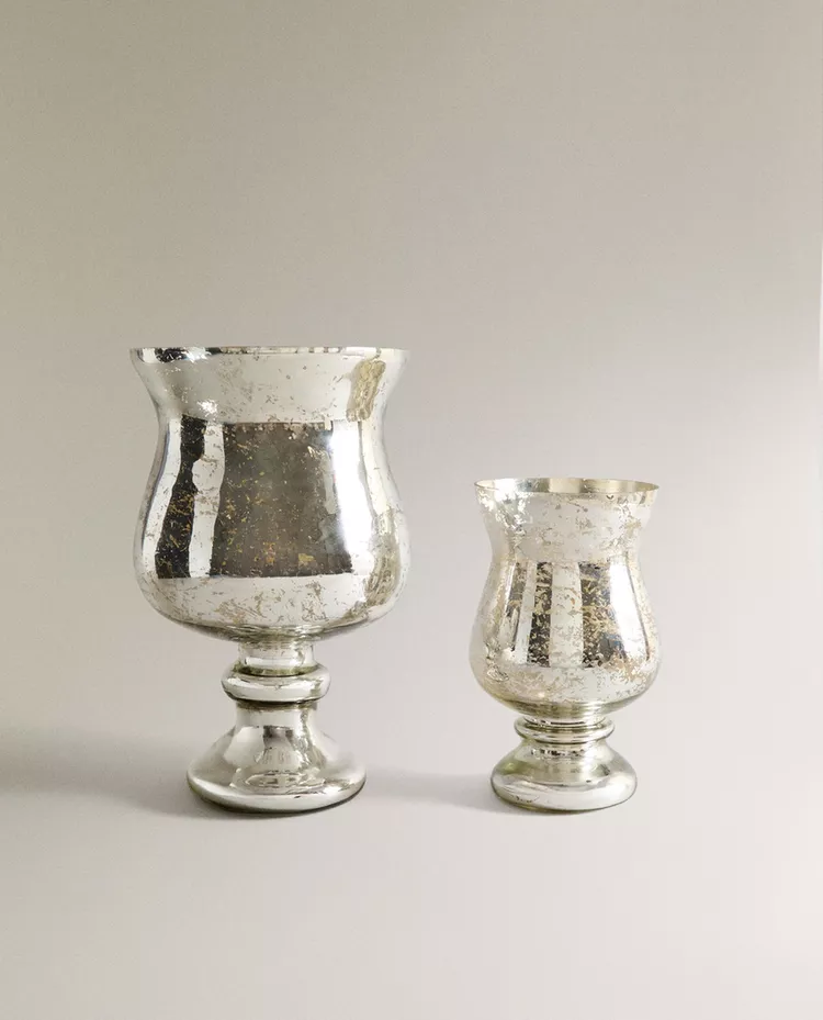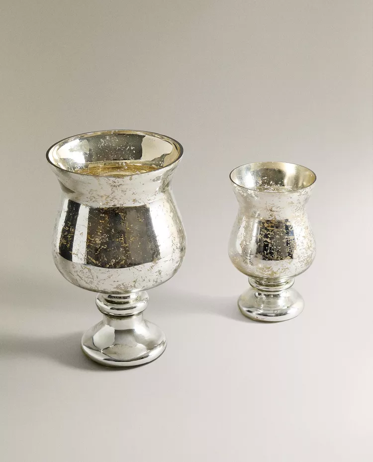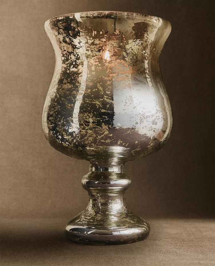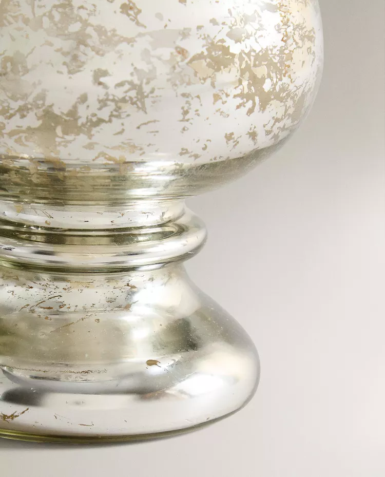 Высокий стеклянный подсвечник в форме винного бокала для рождественских свечей с блестящей поверхностью.