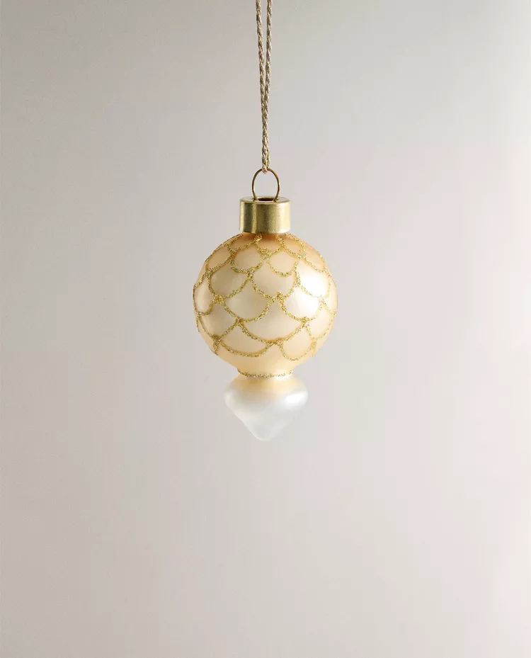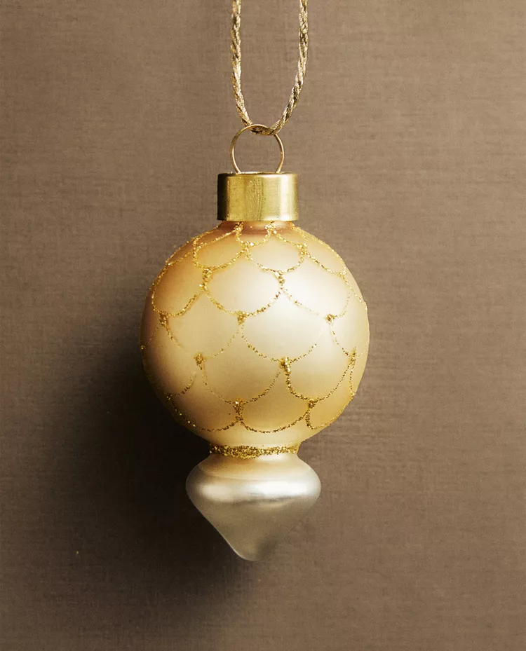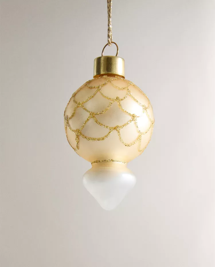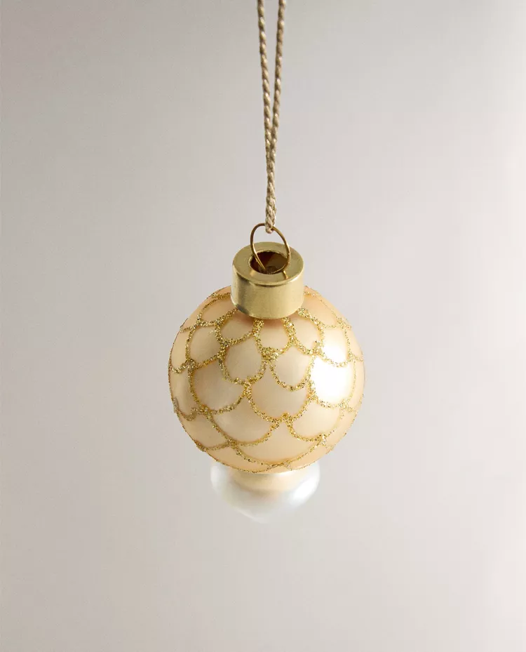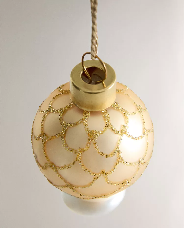 Елочная игрушка из боросиликатного стекла в виде двойного шара с блестящими чешуйками на главном шаре.
