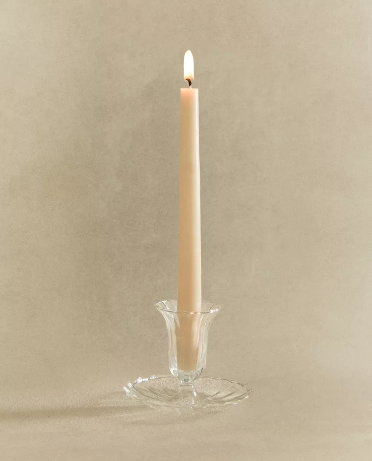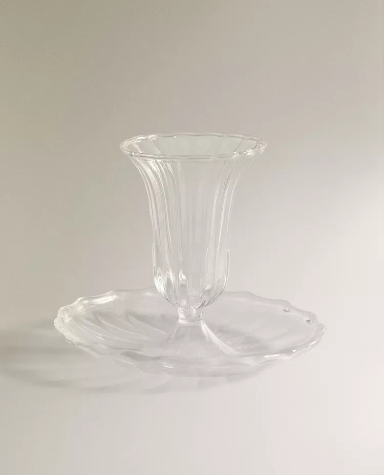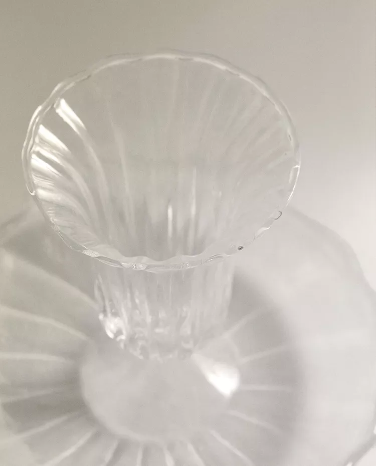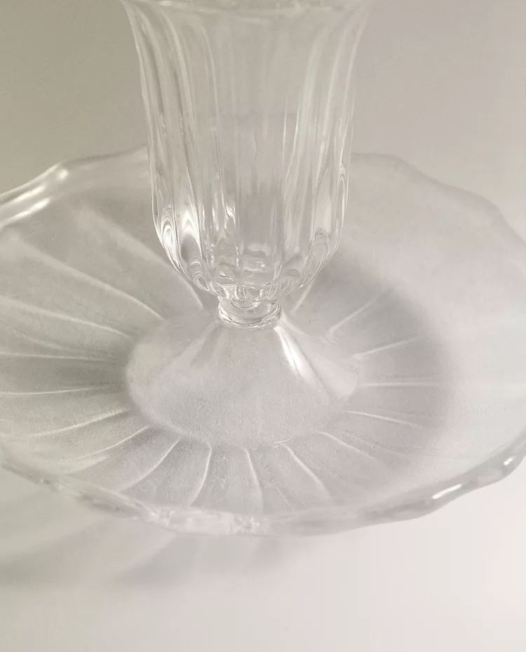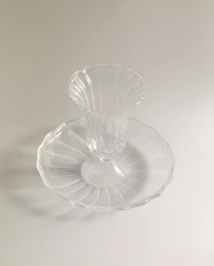 Подсвечник из прозрачного стекла в форме блюдца с центральной опорой для свечи. Волнистый край.