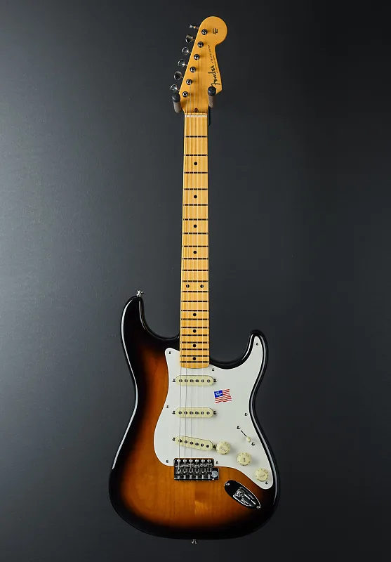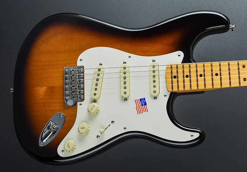 Двухцветный Sunburst, блестящее покрытие из нитроцеллюлозного лака, корпус из ольхи, гриф Soft V из цельного клена с радиусом 12 дюймов и средние джамбо-ладовые порожки, длина мензуры 25,5 дюйма, ширина порожка 1,650 дюйма, специально настроенные сингловые звукосниматели Eric Johnson Strat, 5-позиционный переключатель с основным регулятором громкости, регуляторами тембра 1 (звукосниматель у грифa) и 2 (звукосниматель у бриджа), американское винтажное синхронизированное тремоло с изгнутыми стальными седлами, винтажное оформление.»