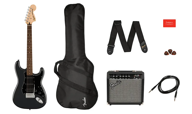 Обеспечивая 15 ватт чистого звука Fender, усилитель Frontman 15G имеет как чистый, так и овердрайв-каналы, трехполосный эквалайзер, разъем для наушников для тихой практики и вход AUX для подключения медиа-устройства. В комплекте идет мягкий чехол для переноски. сумка, медиаторы, ремень и 3-метровый кабель - комплект Squier Affinity Stratocaster HSS имеет все необходимое, чтобы превратить вашу любовь к музыке в пожизненную страсть.