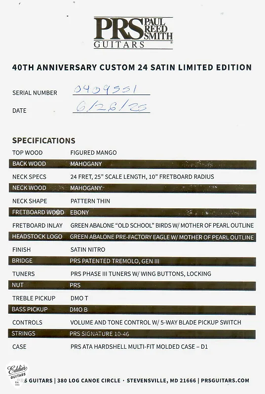 Этот памятный выпуск продолжает круглогодичное празднование 40-летия PRS. Всего будет выпущено только 500 экземпляров этой модели Custom 24 Satin Limited Edition 40th Anniversary. В комплекте прилагается сертификат 40th Anniversary с подписью вручную.