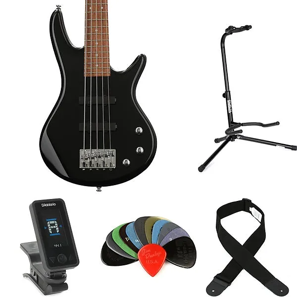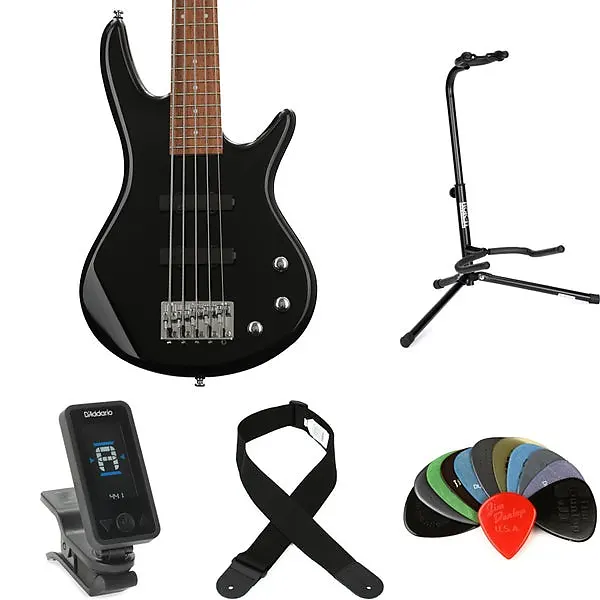 5-струнная электрическая бас-гитара с корпусом из тополя, гриф из клена, накладка из ятоба, 2 сингловых звукоснимателя, подставка, ремень, клипсовый тюнер и медиаторы - черная.