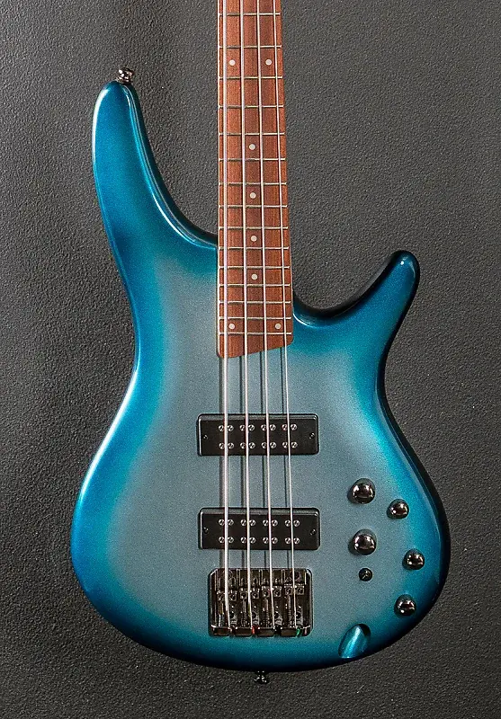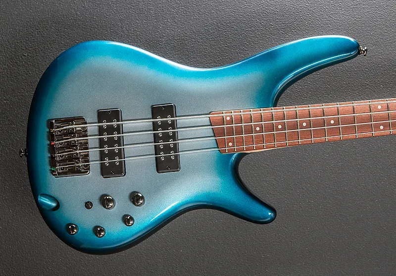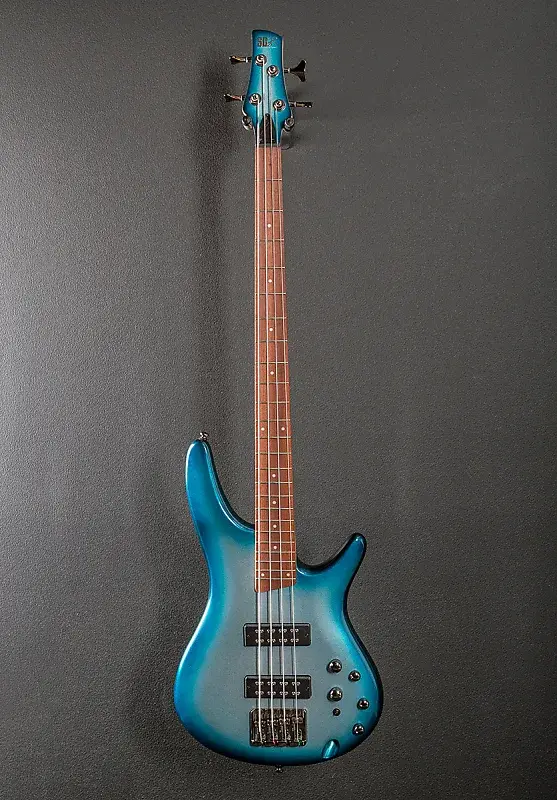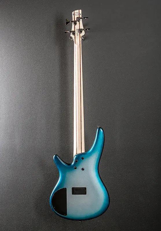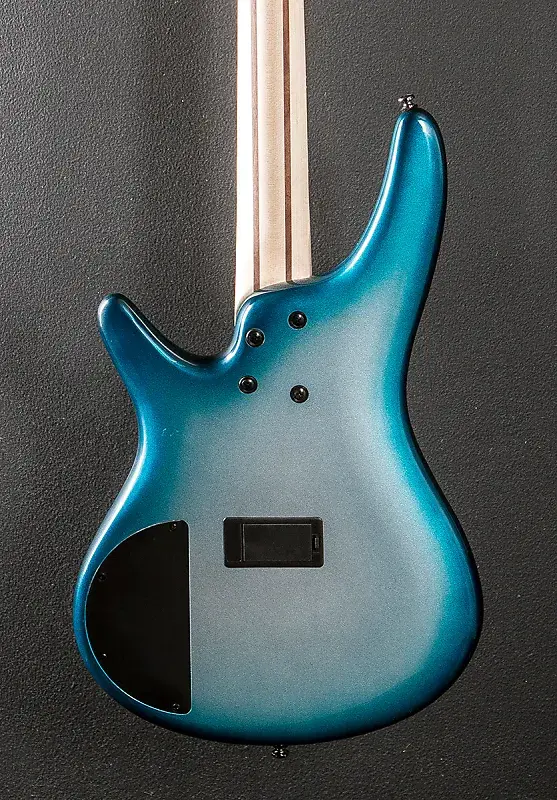 Глубокий океан металлический, глянцевая отделка корпуса, корпус из нятoлa, шейка SR4 из пяти частей клена/ореха, гриф из ятобы с радиусом 12" с белыми точечными инкрустациями и средними ладами, длина мензуры 34", ширина грифа у верхнего порожка 1,5", звукосниматели PowerSpan Dual Coil для бриджа и грифа, фирменный 3-полосный эквалайзер Ibanez с 3-позиционным переключателем Power Tap, бридж Accu-cast B120 и литые/запечатанные колки, вес 3,8 кг, кейс не входит в комплектацию