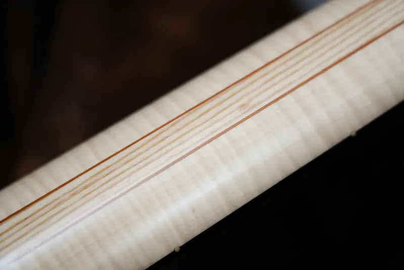 Гриф из платана имеет много узоров и заключен между ясенем, поэтому несмотря на узкий гриф, он рассчитан на сопротивление деформации.