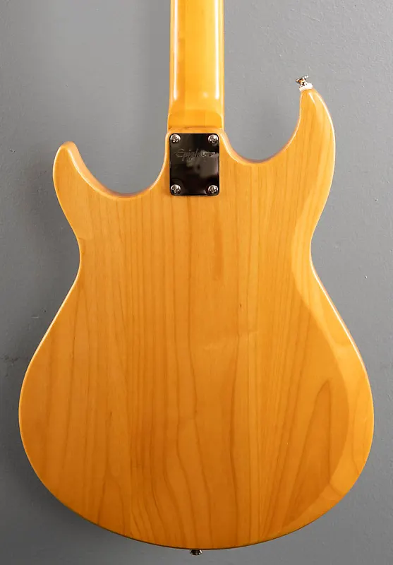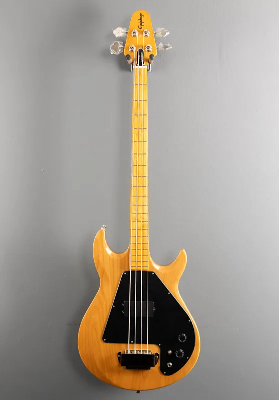 Натуральный, корпус из 3 частей из ольхи, кленовый гриф радиусом 12 дюймов с инкрустациями Pearloid Dot и ладами Medium Jumbo на C-образном грифе из 3 частей, длина мензуры 34 дюйма, ширина порожка 1,61 дюйма, звукосниматель Epiphone Bass Humbucker, регуляторы громкости и тембра с мини-переключателем с разъемом катушки, 4-струнный бридж Grabber с крышка, литые тюнеры с клеверовыми кнопками, 9,2 фунта, поставляется с сумкой для переноски.