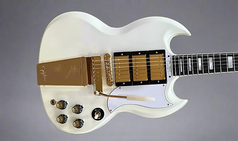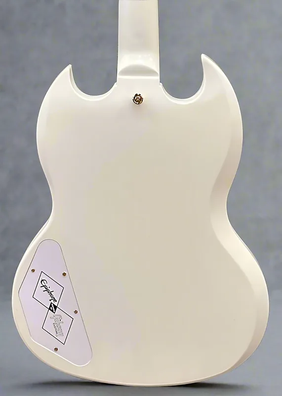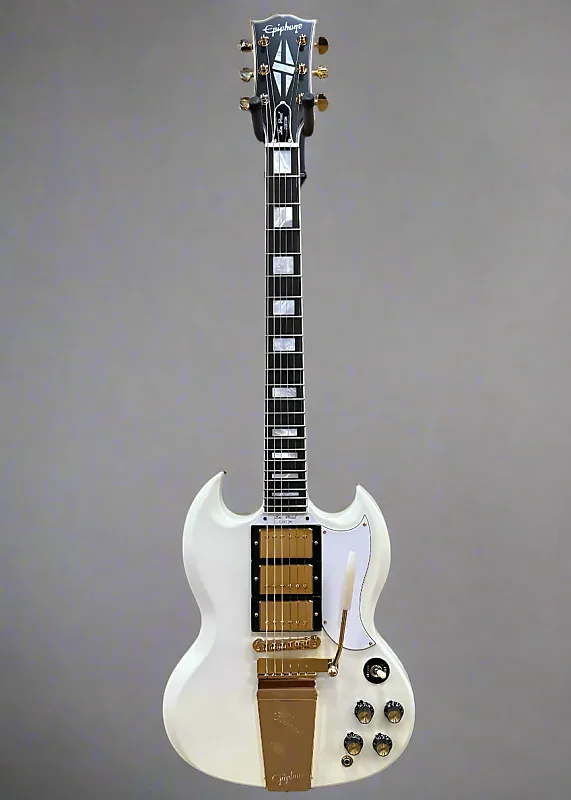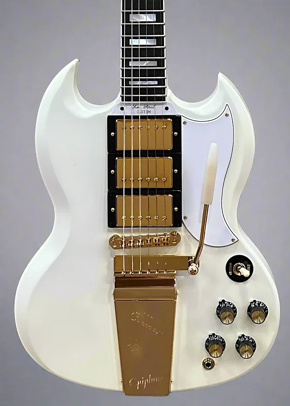 «Созданная в сотрудничестве с Gibson Custom, модель Epiphone 1963 Les Paul SG с Maestro Vibrola является потрясающей реконструкцией классической винтажной модели. 1963 год стал последним годом, когда на SG Custom использовалась маркировка «Les Paul», и первым годом для Maestro Vibrola. Превосходная отделка, которая делает эту модель такой любимой и желанной, здесь полностью сохранена, включая цельный гриф из махагони с длинным шипом, профиль SlimTaper и накладку на гриф из эбена с окантовкой. Также она оснащена вставками из перламутра на грифе в виде блоков и декоративной вставкой Custom split diamond на головке грифа в стиле Gibson «open book» с окантовкой. Электроника не менее впечатляющая: три хамбакера Gibson Custombucker из США, ручная проводка к потенциометрам CTS, конденсаторам Mallory и переключателю выбора звукоснимателя и разъему Switchcraft. Отделка VOS (Vintage Original Sheen) Classic White гармонично сочетается с золотой фурнитурой, включая колки Grover Rotomatic с передаточным числом 18:1.»