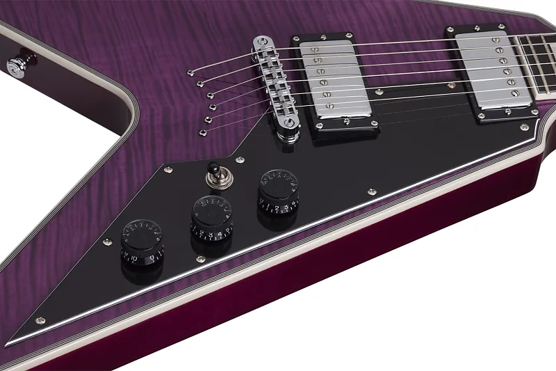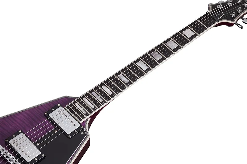 Гитара Schecter V-1 Custom с множеством функций имеет корпус из красного дерева с верхней декой из кленового спила. Сборный кленовый гриф оснащен фирменным ультралегким соединением Schecter, которое позволяет легко достигать высоких нот. На грифе установлен накладка из черного дерева с 22 экстра-джамбо ладами для долговечности и устойчивости звука.