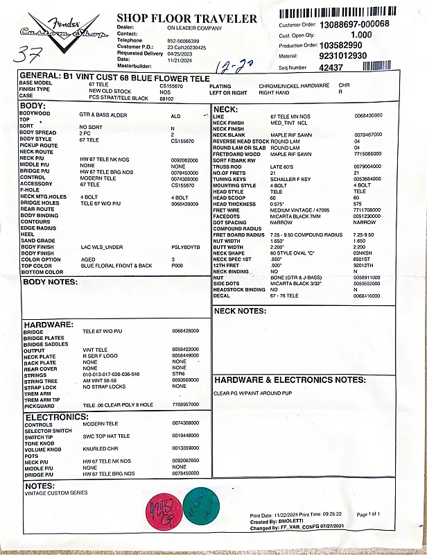 Корпус из двух частей отборного ольхового дерева покрыт лаком NOS с нижним слоем WLS поверх знаменитого узора Paisley или Blue Flower. Гриф из клена с продольной распилкой имеет профиль '60-го стиля "овал C", покрытый круглым ламинатом. гриф из клена с радиальным распилом, радиус 7,25"-9,5" (винтажный составной радиус), 21 средний винтажный лад для удобного ощущения при игре вверх и вниз. Ручные катушки звукоснимателей '67 Tele соответствуют точной спецификации того года, с трехпозиционным переключателем и современной проводкой Tele. Другие особенности включают прозрачный полиуретановый плечевая панель с восемью отверстиями, мост '67 Tele с резьбовыми стальными седлами, колки Schaller «F», кость в порожке и механизмы для струны на крыле. В комплект входят жесткий кейс Deluxe, ремень и сертификат подлинности.