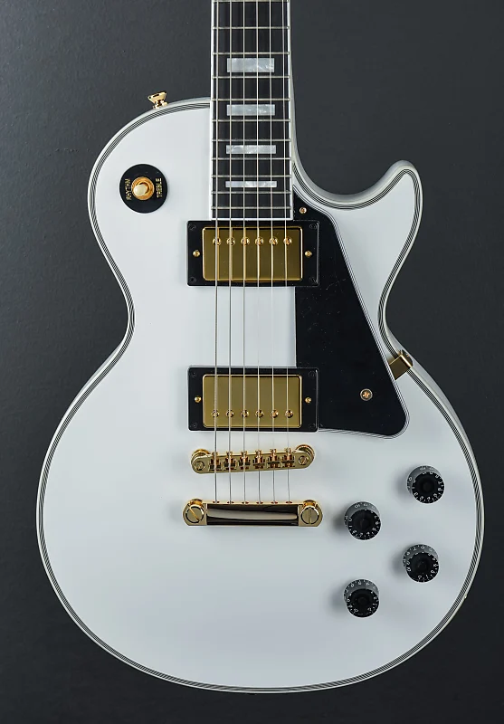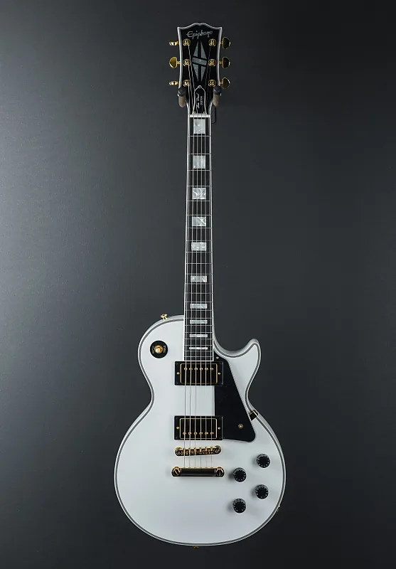 «В рамках продолжающегося сотрудничества с Gibson Custom, Epiphone с гордостью представляет флагманскую модель Les Paul Custom в линейке Inspired by Gibson Custom. Эта прекрасная гитара, полный комплект элегантных «смокинговых» деталей, известных для этой модели, оснащена цельножаланым грифом из махагона с профилем 50-х Rounded C, накладкой на гриф из эбена и шашечными вставками из перламутра. На головке грифа в стиле Gibson с «открытой книгой» также имеются вставки из перламутра в виде разделенного ромба и логотипа Epiphone. Золотая фурнитура, включая колки Grover Rotomatic с передаточным числом 18:1, придает гитаре еще больше визуальной привлекательности. Корпус из цельного махагона с кленовой крышкой добавляет немного яркости звучания, а звукосниматели Gibson USA 490R и 498T обеспечивают тональную изысканность и достаточную мощь, чтобы подчеркнуть всю красоту инструмента. Они подключены вручную к потенциометрам CTS, разъему Switchcraft и переключателю звукоснимателей, а также к конденсаторам Mallory. Линейка Inspired by Gibson Custom с двойным ромбом» Логотип находится на задней части головки грифа, также включен черный жесткий чехол с логотипом Inspired by Gibson Custom и внутренней отделкой золотисто-желтого цвета.