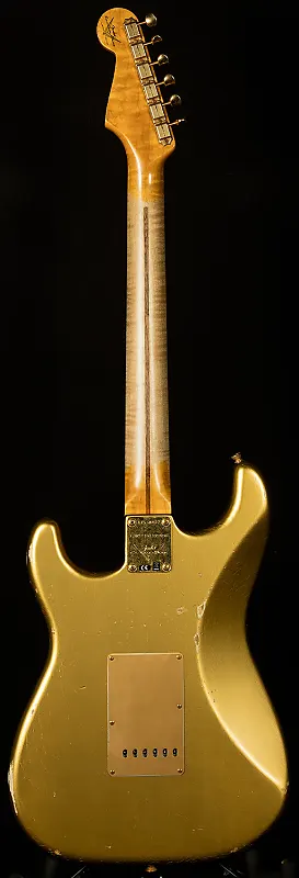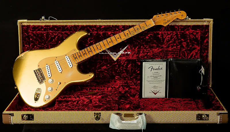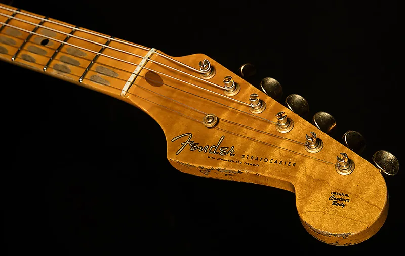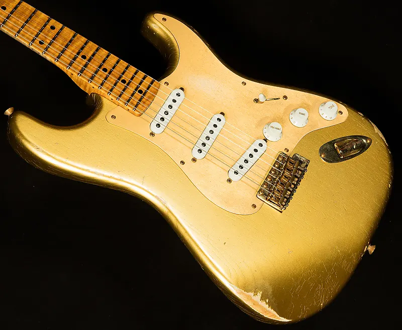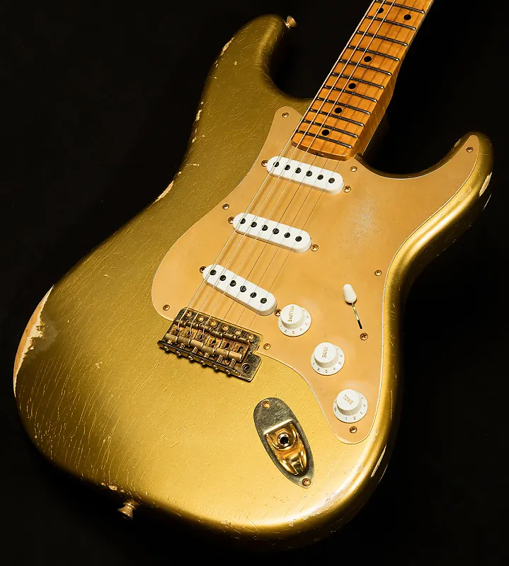 Мастером разработанные вручную намотанные звукосниматели Bone Tone обеспечивают большое динамическое пространство при меньшем количестве витков тяжелой проволоки Formvar, фасетированные магниты Alnico 2 и крышки звукоснимателей ’54. Пятипозиционный переключатель подключен к схеме "½ blender", что позволяет смешивать звук грифа в положениях 1 и 2. Другие особенности включают восьмидырочную золотую анодированную накладку, тремоло в винтажном стиле Custom Shop, винтажные колки, кость в качестве порожка и винтажный струнодержатель-диск с металлической проставкой. В комплект входит роскошный футляр, ремень и сертификат подлинности.