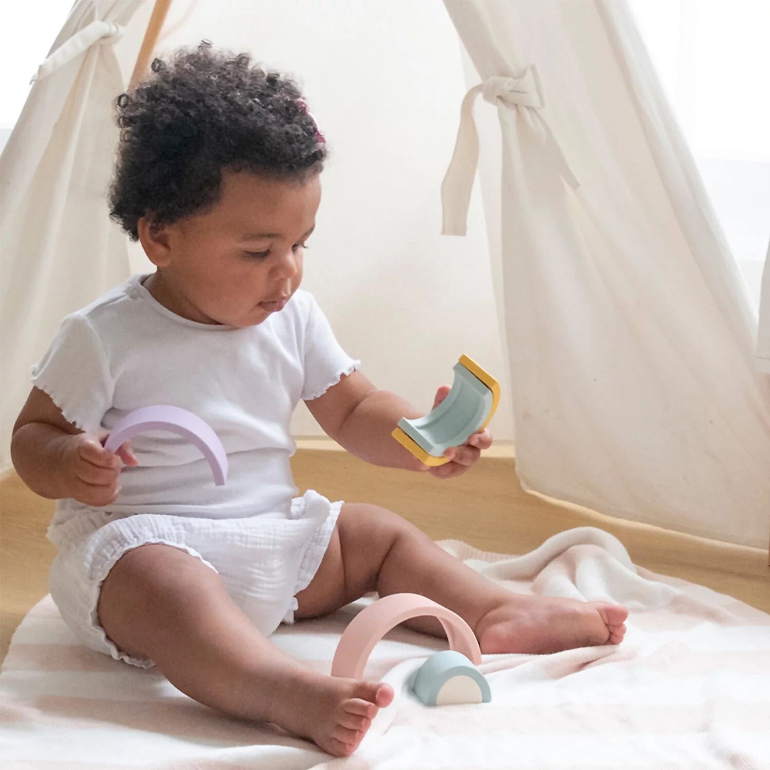 Ваш малыш сможет строить радуги, башни, арки и скульптуры с помощью этого красочного радужного штабеля от Playground.