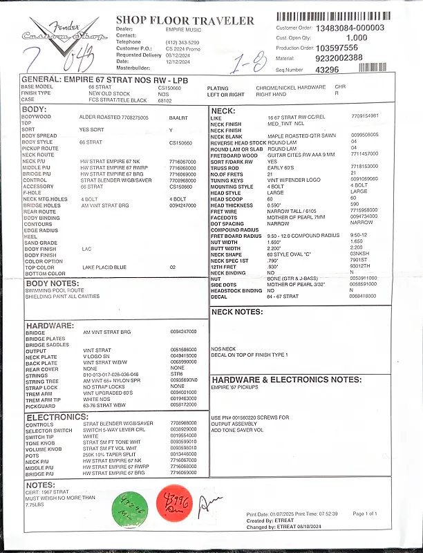 - Характеристики грифа 1-я: • 12-й лад: 0,930”• Окантовка грифа: нет• Левая кость: кость• Боковые точки: перламутр 3/32”• Окантовка головки грифа: нет• Декаль: 64-67 Strat• Вес: 7 фунтов 3 унцииНаши сертифицированные специалисты Custom Shop выполняют полную профессиональную настройку и проверку в соответствии с заводскими стандартами перед отгрузкой или самовывозом, обеспечивая выдающийся опыт игры!