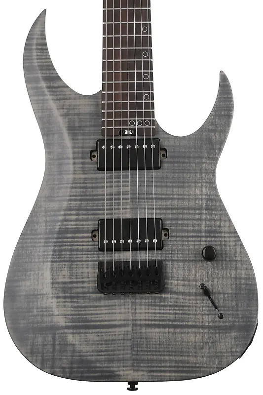 Семиструнная электрогитара с цельным корпусом из нятоха, многослойной грифиной из клена и розового дерева, грифом с накладкой из эбена и двумя хамбакерами - серого цвета.