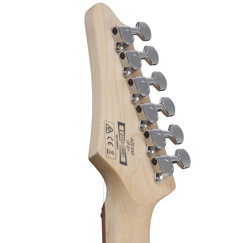 AZES40 оснащена корпусом из тополя, прикрученным к грифу из клена с грифовой накладкой из ятоба и белыми точечными метками положения. Ее масштаберная длина 25 дюймов немного короче, чем у среднестатистической электрогитары, что, по словам Ibanez, может быть идеально для начинающих музыкантов.