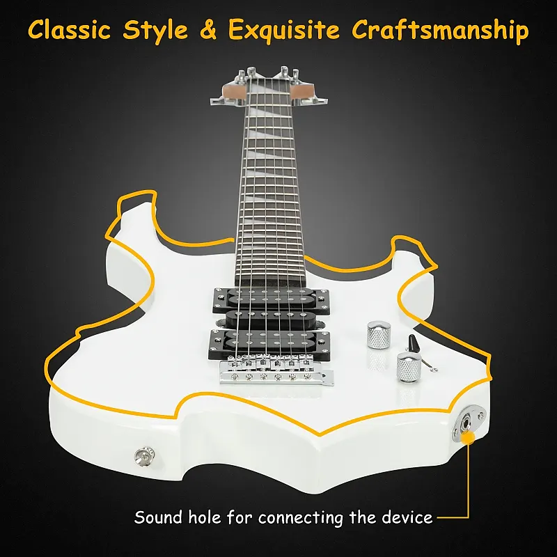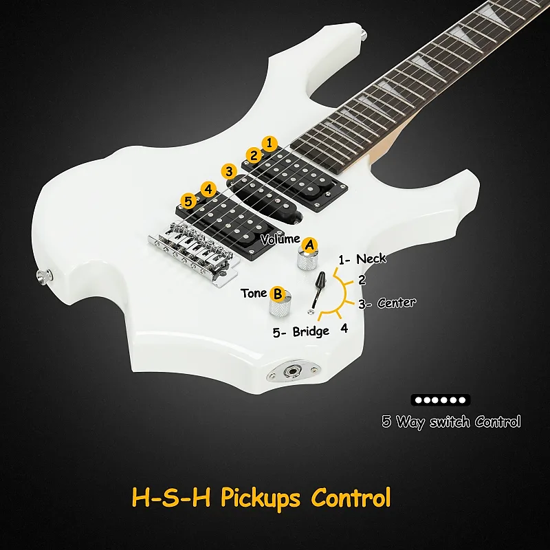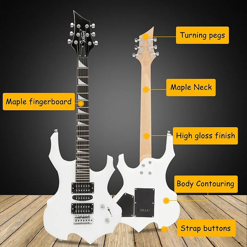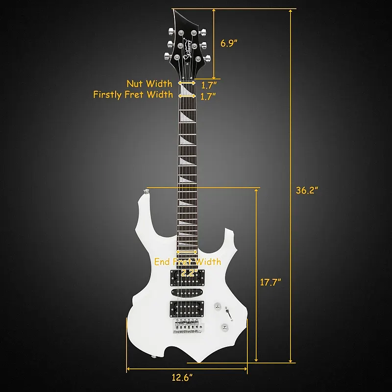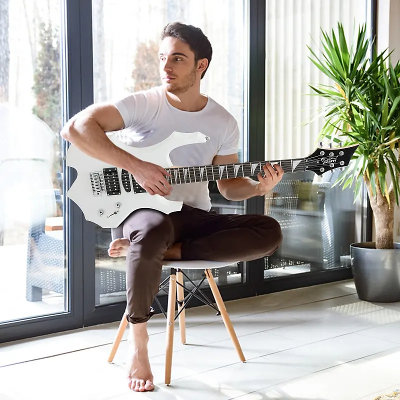 Уникальный дизайн электрогитары в форме пламени привлекает внимание и добавляет индивидуальность вашему исполнению. Узоры на корпусе с 24 ладовыми ладами также создают эффектный вид, выделяя вашу гитару среди других.