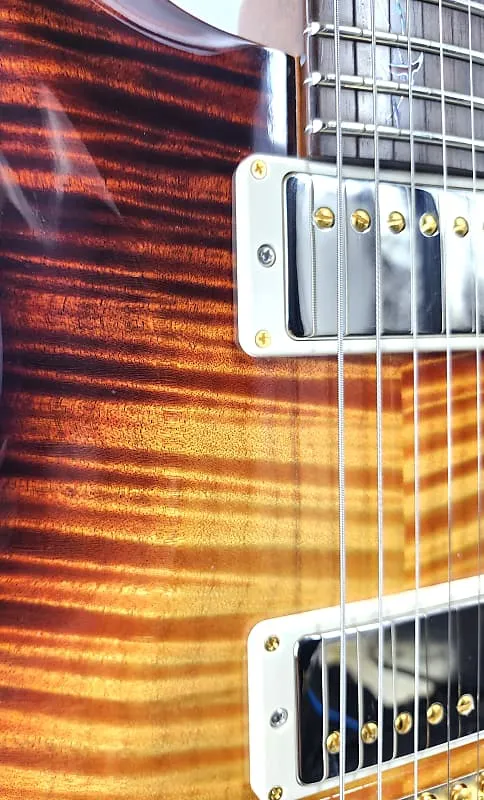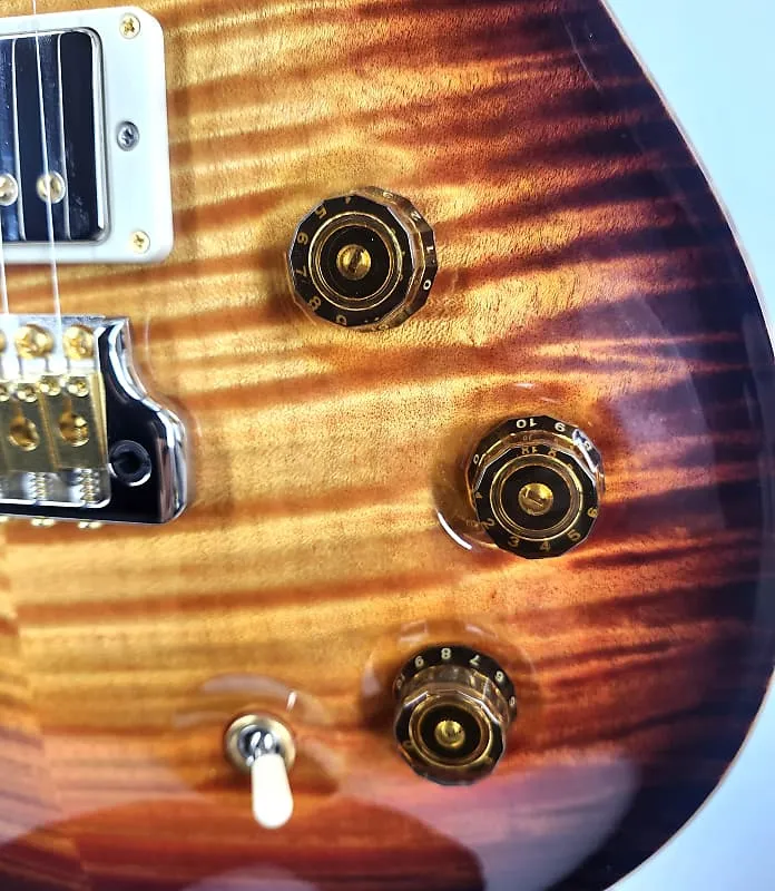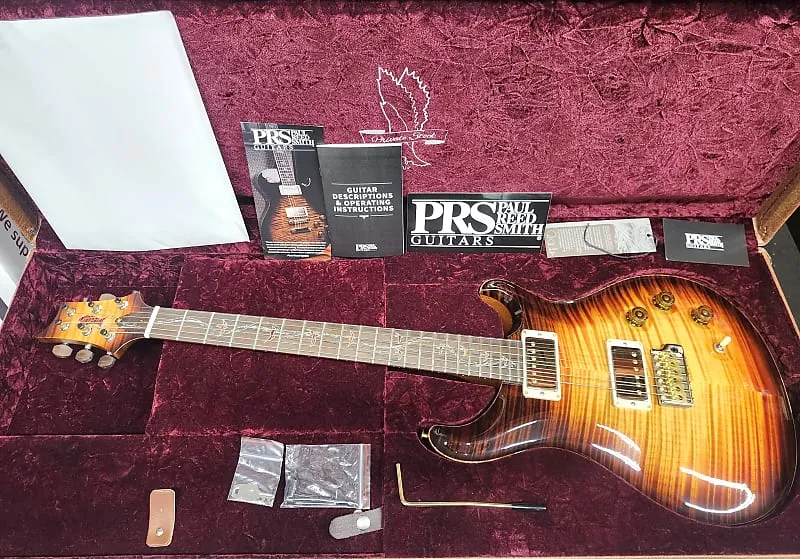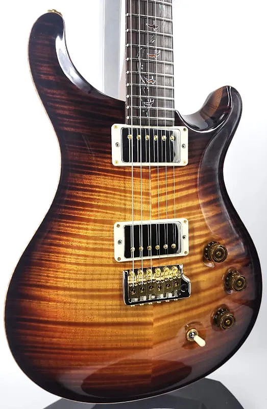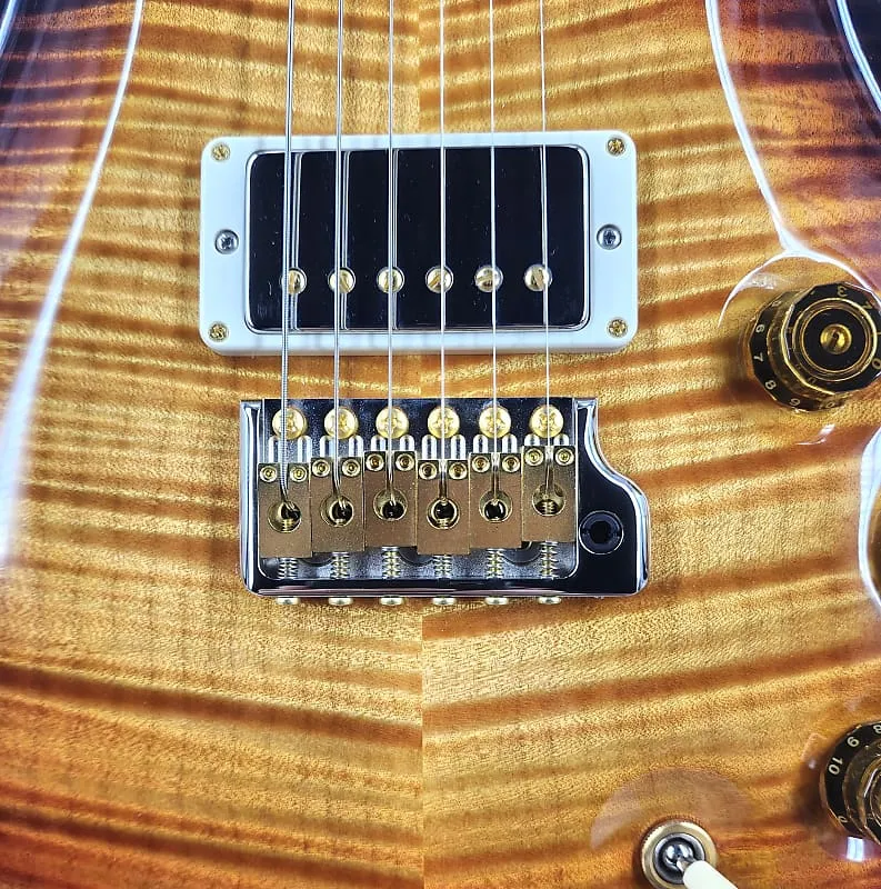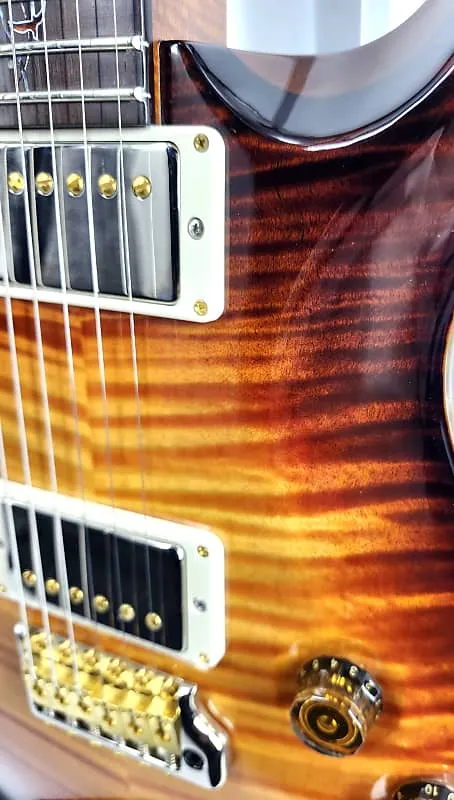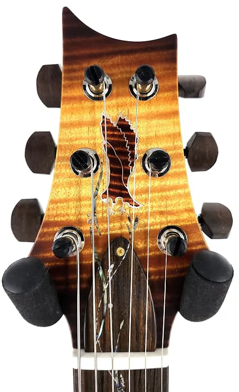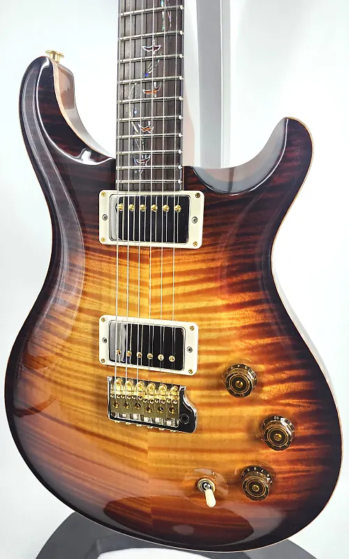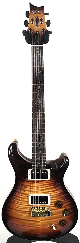 совпадает с контуром из белого перламутраТип отделки: корпус: высокоглянцевый нитро лак, гриф: сатиновый нитро лакСингл датчик: DGTБасовый датчик: DGTЭлектроника: два регулятора громкости, один регулятор тембра с функцией push/pull и 3-позиционный переключательФурнитура: золотая/никелевая PRS Gen "Tremelo" мост, фиксирующие колки PRS Phase с бразильскими розовыми кнопками, задние панели из африканского махагона, кость на порожке, крышка стержня из бразильского палисандра с инкрустацией из раковины пауаНастройка: PRS Signature .10Чехол: кожа коричневого цвета для Private StockОсобенности: высокоглянцевое/сатиновое нитро покрытие, верх из кудрявого клена, задняя часть и гриф из махагона, грифовая накладка из бразильского палисандра, отметки в виде птиц из кудрявого клена с инкрустацией из пауа в честь 30-летнего юбилея, фурнитура из золота/никеля, и фирменные датчики DGT. Древесина для этой гитары была отобрана из хранилища PRS Private Stock.