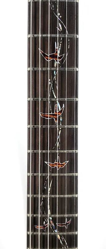 - Инкрустация накладки: Птицы из кудрявого клена к 30-й годовщине, окрашенные в тон с белым перламутровым контуром и вставкой Paua vine