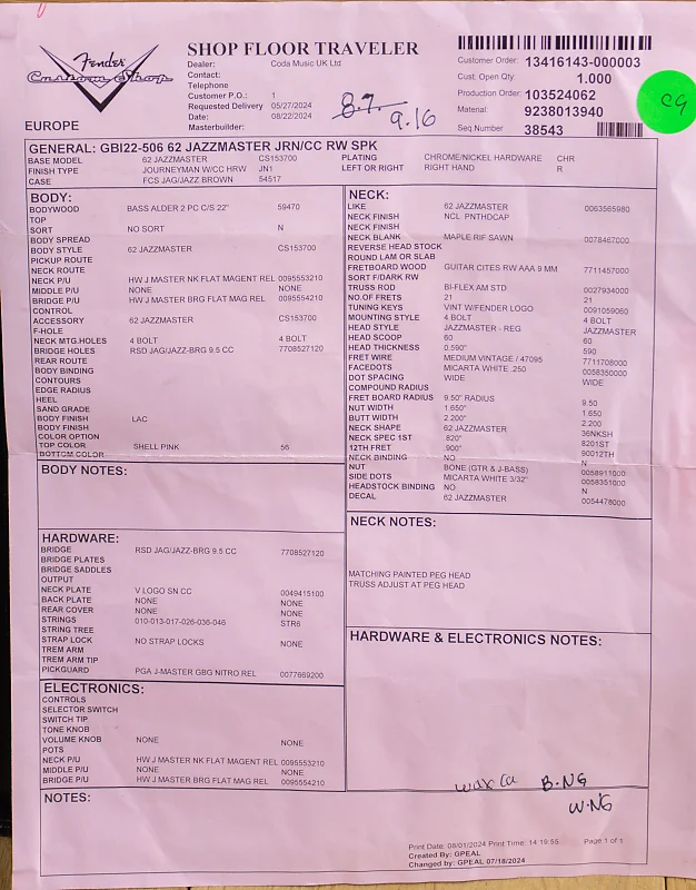 РИФЛЕНЫЙ КЛЕНОВЫЙ ГРИФ С ПРОФИЛЕМ JAZZMASTER C 60-Х ГОДОВ (.820-.900)