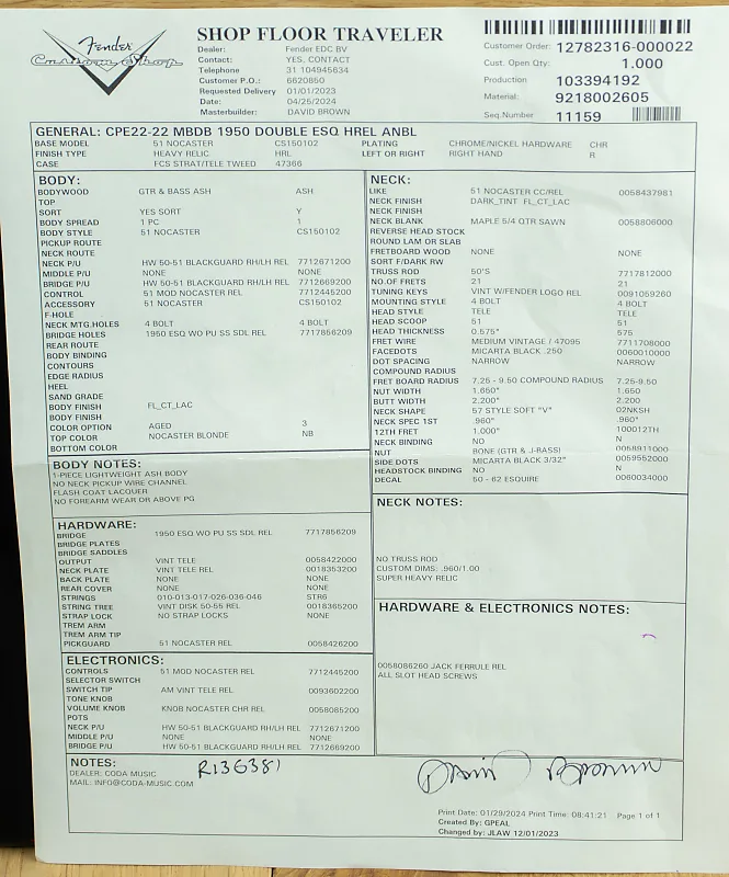 Дэвид Браун Masterbuilt 1950 Double Esquire Heavy Relic в цвете Aged Nocaster Blonde с корпусом из 1 куска ясеня, 57 мягким V-образным профилем грифа и пикапами Josefina Handwound 50-51 Blackguard