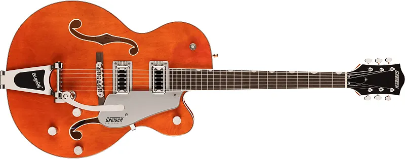 Модель G5420T Electromatic Classic Hollow Body Single-Cut с тремоло Bigsby оснащена корпусом из ламинированного клена с винтажными очертаниями и изящными арками, а также новой распорной конструкцией блока (trestle block), которая помогает уменьшить нежелательные фидбэки. За счет увеличенной жесткости и контакта верхней и нижней частей корпуса новый дизайн блока обеспечивает более быстрый аттак и более сфокусированный звук с ярким «щелчком» и увеличенной длительностью звучания. В сочетании с новыми звукоснимателями FT-5E Filter’Tron голос этой полой гитары обладает мощным объемным ударом, классическим колокольным оттенком и повышенной насыщенностью, ясностью и четкостью нот.