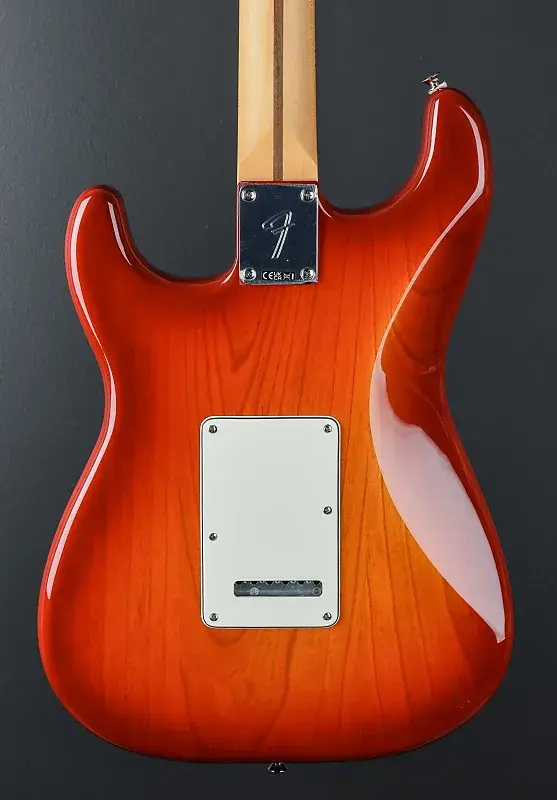 Aged Cherry Burst, сделано в Мексике, глянцевая полиэфирная отделка корпуса, корпус Chambered Ash, современный C-образный кленовый гриф с кленовым грифом радиусом 9,5 дюйма и средними джамбо-ладами, длина мензуры 25,5 дюйма, ширина порожка 1,650 дюйма, звукосниматели Player series alnico 5 с одной катушкой Strat, 5-позиционное переключение с общей громкостью, тон 1. (нековые/средние звукосниматели) и тембр 2. Управление (бриджевое звукоснимательное устройство), Двухточечное синхронизированное тремоло с гнутыми стальными седлами, Тюнеры Fender ClassicGear, 7,2 фунта, Чехол в комплект не входит