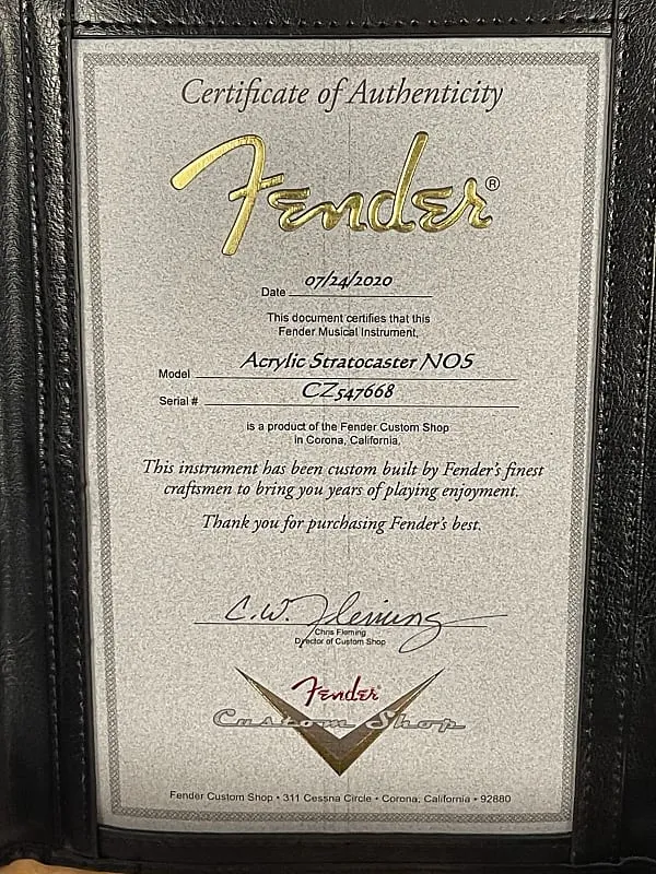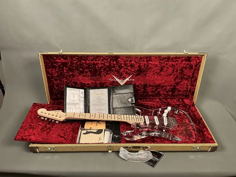Эта уникальная модель Custom Shop была «Мастерски собрана» Скоттом Бюэлем. Прозрачное акриловое тело Stratocaster демонстрирует все кропотливые работы и тонкие детали, вложенные в этот впечатляющий инструмент. Три винтажных одноразрядных звукоснимателя Stratocaster, контроллеры громкости и тембра, а также 5-позиционный переключатель выделяются на фоне акрила, словно парят в воздухе, обеспечивая необходимое звучание, управление и уникальный внешний вид, чтобы привлечь внимание публики. Среди других качественных особенностей - гриф '56 Strat из клена четверти с 5/4 распилкой, гриф с 21 ладом и радиусом 9,50", костяной порожек и гладкая хром/никелевая фурнитура.