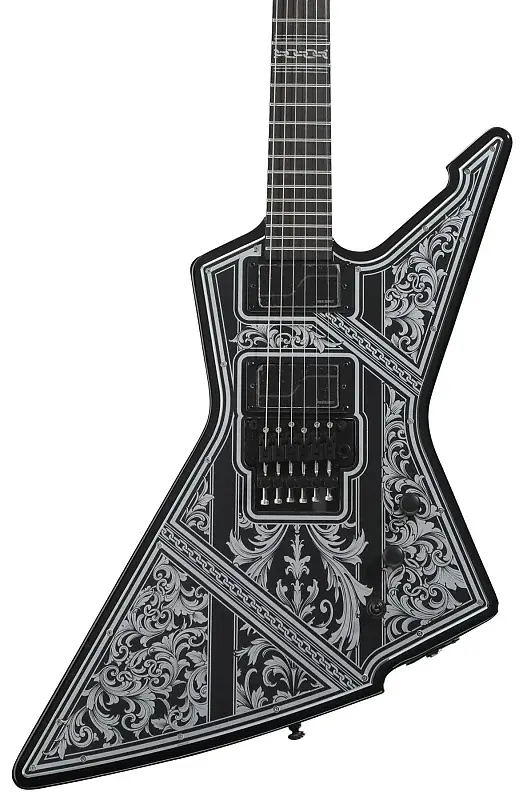 Электрогитара с цельным корпусом, верхняя панель из анодированного алюминия, корпус из красного дерева, гриф из клена, накладка грифа из падука, 2 активных хамбакера, тремоло Floyd Rose - глянцевый черный, Przym.