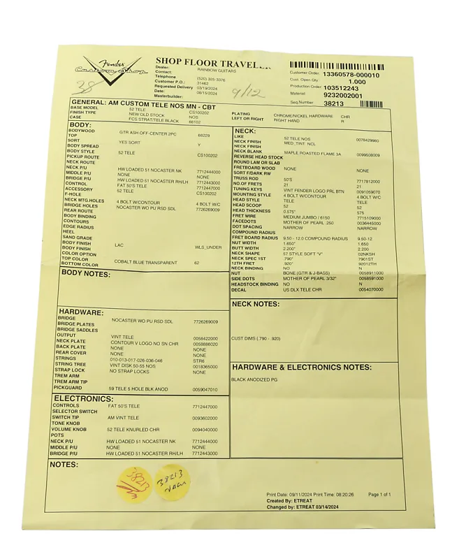 эстетика.Другие премиальные особенности включают форму спинки '57-style Soft "V", контурированную пятку, радиус составной накладки от 9,5" до 12", 21 медиум-джамбо лад (6150), 3-позиционный переключатель, мост '51 Nocaster с компенсированными латунными седлами RSD, колковые механизмы в винтажном стиле с белыми перламутровыми кнопками, кость в качестве верхнего порожка, диск для струны, элитный жесткий чехол, ремень и сертификат подлинности.