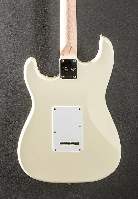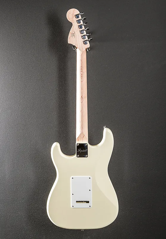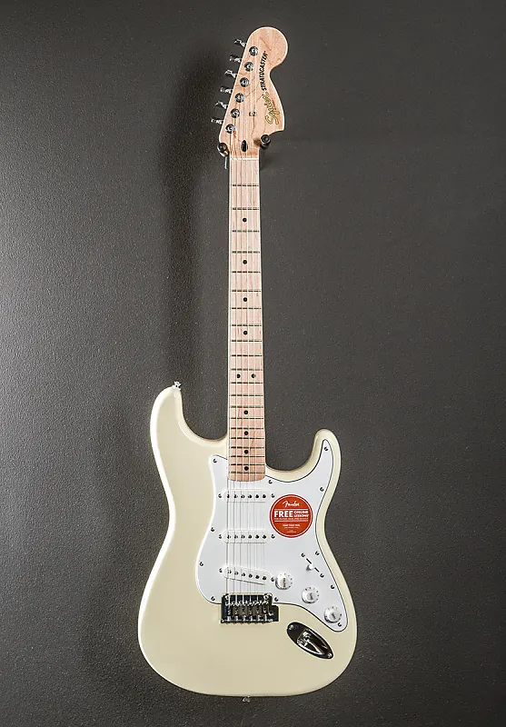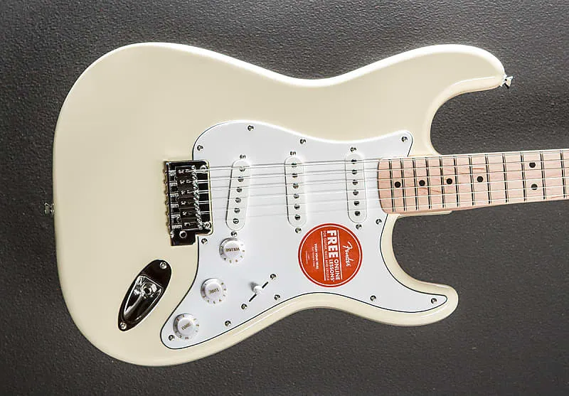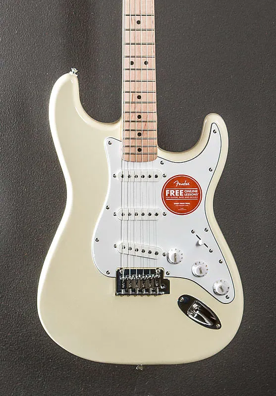 Олимпийский белый, изготовлен в Индонезии, глянцевый полиуретановый корпус, корпус из тополя, C-образный кленовый гриф с кленовым грифом радиусом 9,5 дюйма и средними джамбо-ладами, длина мензуры 25,5 дюйма, ширина порожка 1,650 дюйма, керамические звукосниматели Strat с одной катушкой, 5-позиционное переключение с общей громкостью, тон 1. (нековые/средние звукосниматели) и тембр 2. Органы управления (захват в бридже), двухточечные синхронизированные тремоло с блочными седлами, стандартные литые колки, 7,0 фунтов, чехол не входит в комплект