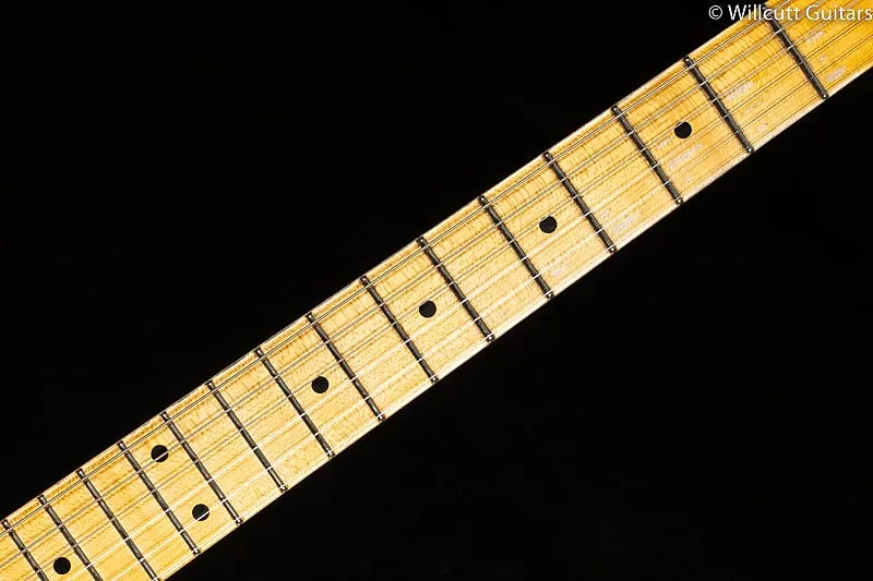 1958 год был последним годом выпуска оригинальной однокусковой кленаевшей грифовой доски, прежде чем Лео Фендер перешел на наклеенную «плитную» грифовую накладку из розового дерева, что значительно изменило внешний вид и звучание инструментов Fender. Многие музыканты клянутся однокусковым кленом за его тон и стабильность, и именно поэтому 1958 год так ценится среди поклонников Strat. Strat Relic 58 года - это дань уважения тому году во всей его славе, с несколькими кастомными модификациями. Корпус из двух кусков отборного ольхового дерева (на модели с натуральной блондинистой отделкой - из ясеня) покрыт лаком Relic, в то время как резонансный однокусковой гриф из срезанного четвертями клена имеет удобный профиль «легкий V» в стиле 1954 года, радиус накладки 9,5 дюймов и 21 узкий высокий лад (6105).