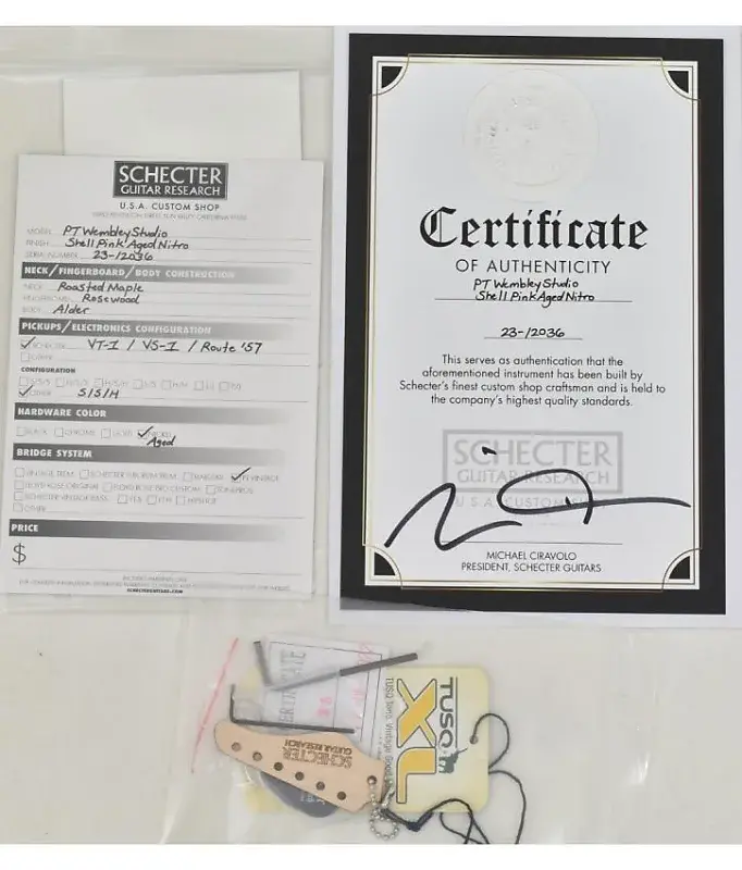 Schecter PT Wembley Studio в цвете Shell Pink - это премиальный инструмент, созданный в мастерской Schecter в США, сочетающий в себе винтажную эстетику и современную удобную игру. От его гладкой шеи из обожженного клена до универсальной электроники, PT Wembley Studio предлагает игровой опыт, подходящий как для живых выступлений, так и для студийной работы. С патинированным нитро-лакoм и тщательной проработкой деталей, эта гитара создана для музыкантов, которые ценят и стиль, и содержание.
