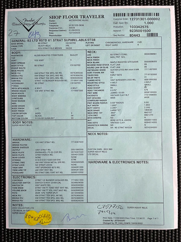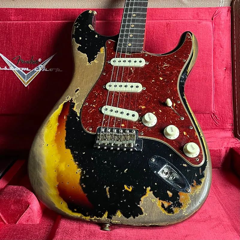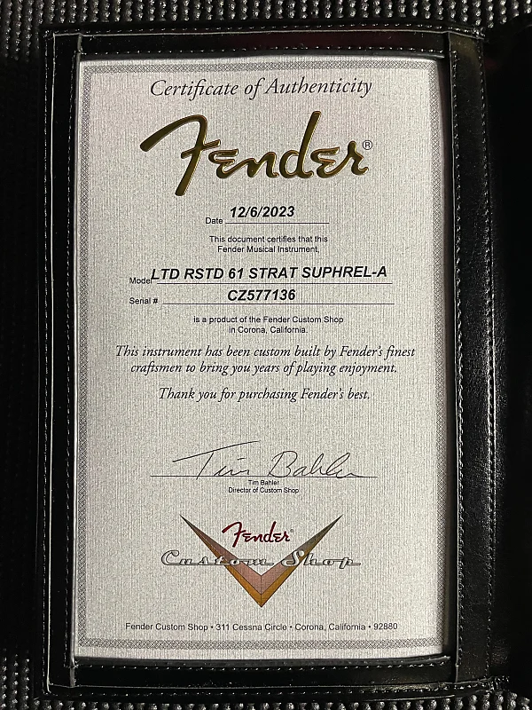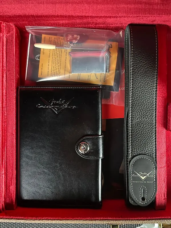Дополнительные особенности включают пластиковую накладку под черепаховый панцирь, винтажный синхронизированный бридж Custom Shop, винтажные колки и костьовый порожек. Также включены фурнитурный кейс премиум-класса, ремень и сертификат подлинности.