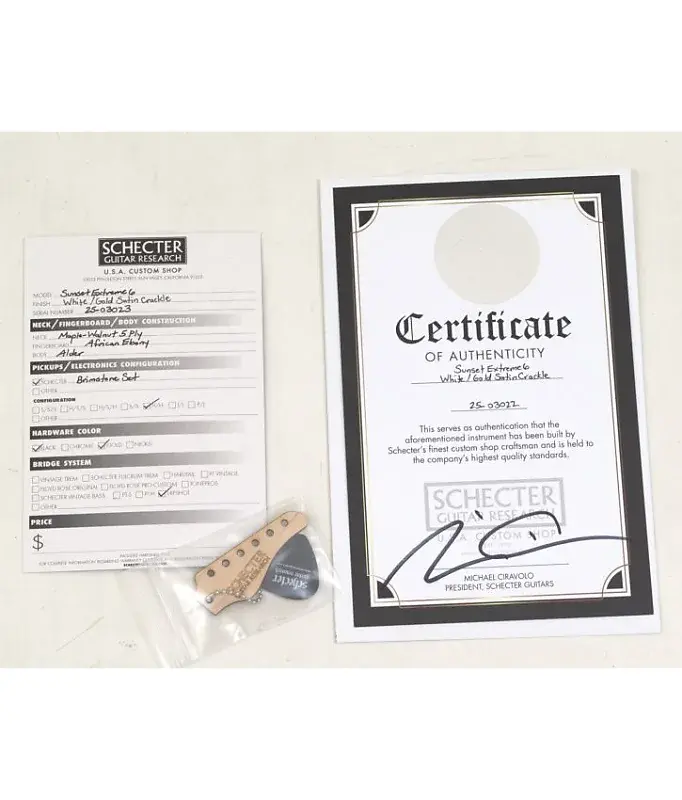 Ручная сборка в США с высокой точностью, Schecter USA Sunset Extreme 6 в цвете Бело-золотой сатиновый кракле является высокопроизводительной машиной, созданной для профессиональных музыкантов. С премиальными тоновыми породами древесины, передовой аппаратурой и агрессивными хамбакерами USA Brimstone, эта современная шред-машина выделяется как по звучанию, так и по стилю.