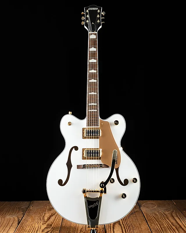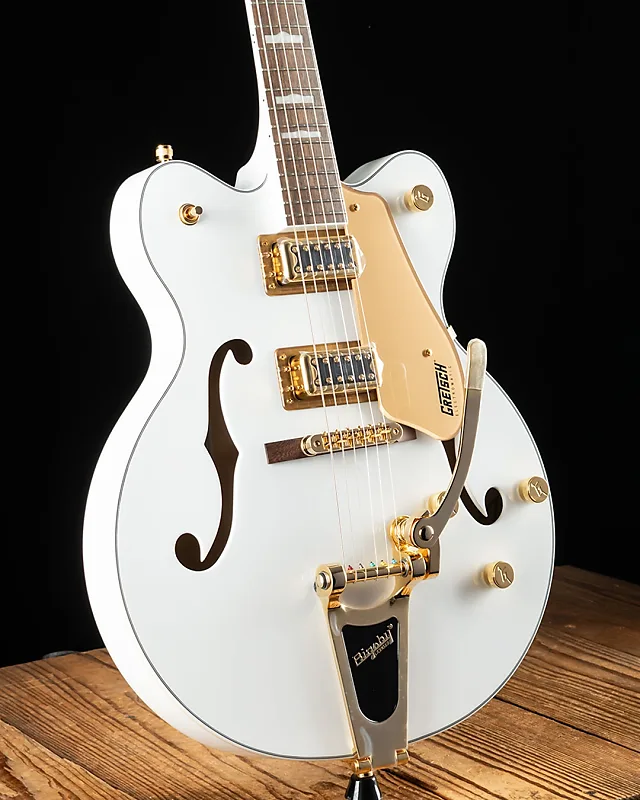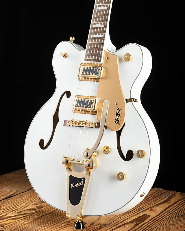Модель G5422TG Electromatic Classic Hollow Body Double-Cut с тремоло Bigsby и золотой фурнитурой оснащена корпусом из ламинированного клена с винтажными контурами и тщательно проработанными изгибами, а также совершенно новой конструкцией опорных блоков для уменьшения ненужной обратной связи. Увеличение жесткости и контакта между верхней и нижней частью корпуса новой конструкцией блоков также обеспечивает более быстрый атака звука с большей концентрацией, резкостью и увеличенной продолжительностью звучания. В сочетании с абсолютно новыми звукоснимателями FT-5E Filter’Tron, голос этой полой конструкции взрывается мощным, насыщенным звуком, классическим «звенящим» оттенком и улучшенной присутствием, ясностью и определением каждой ноты.